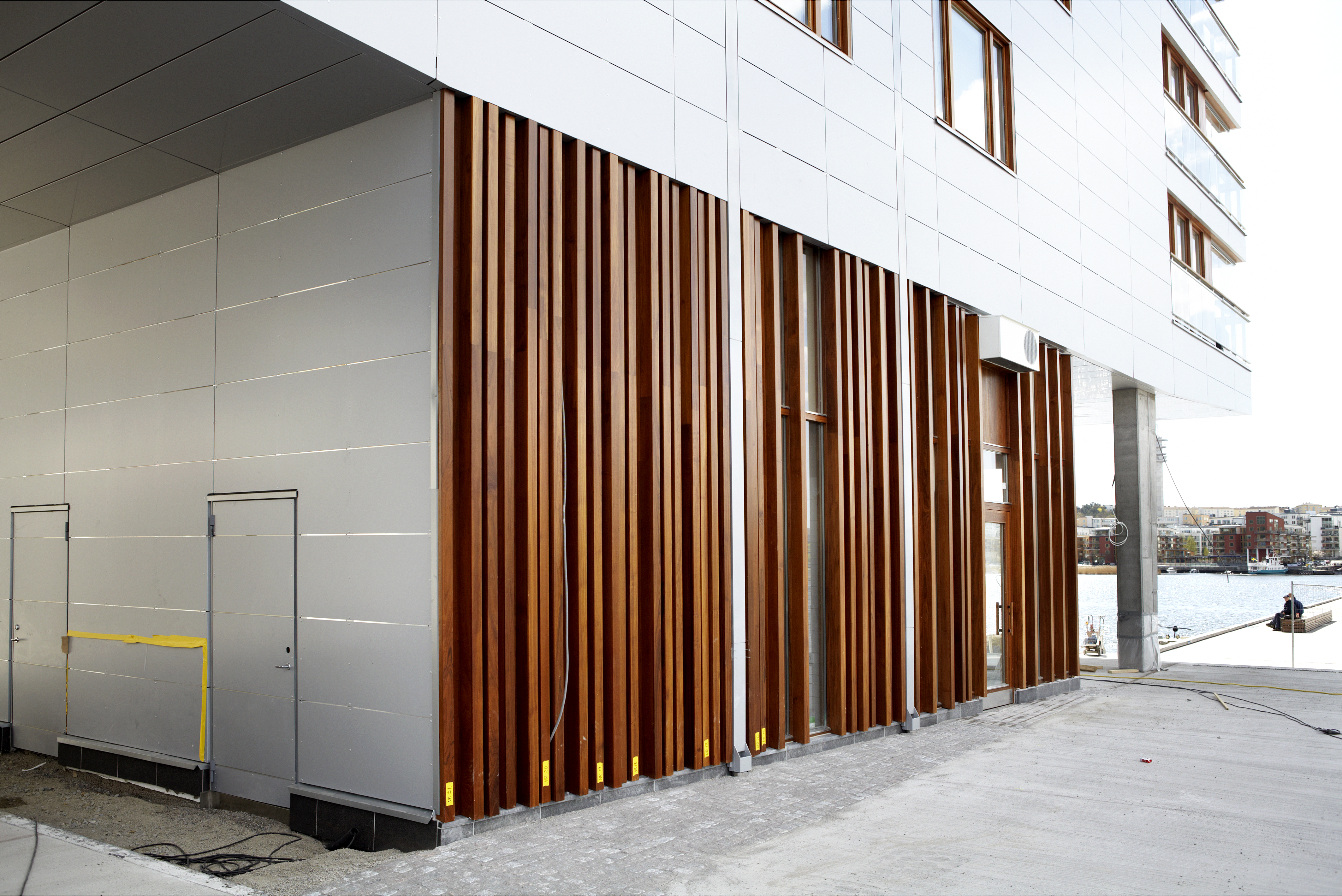 - Beskrivning: Trädetaljer/träinslag på husfasad, nybyggnation. Hammarby Sjöstad.