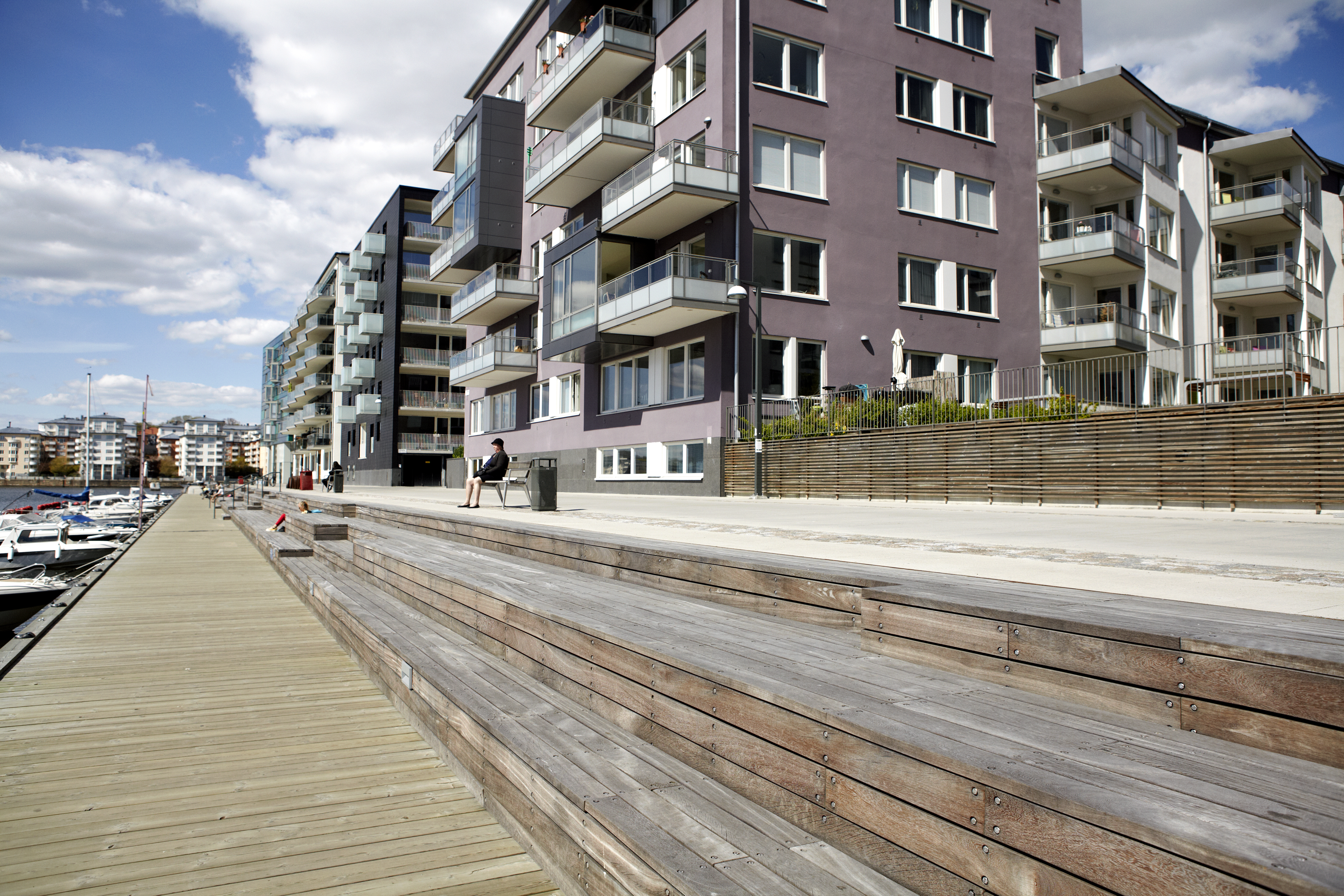 - Beskrivning: Brygga, bänkar, trappor, kaj. Nybyggnation, Hammarby Sjöstad.