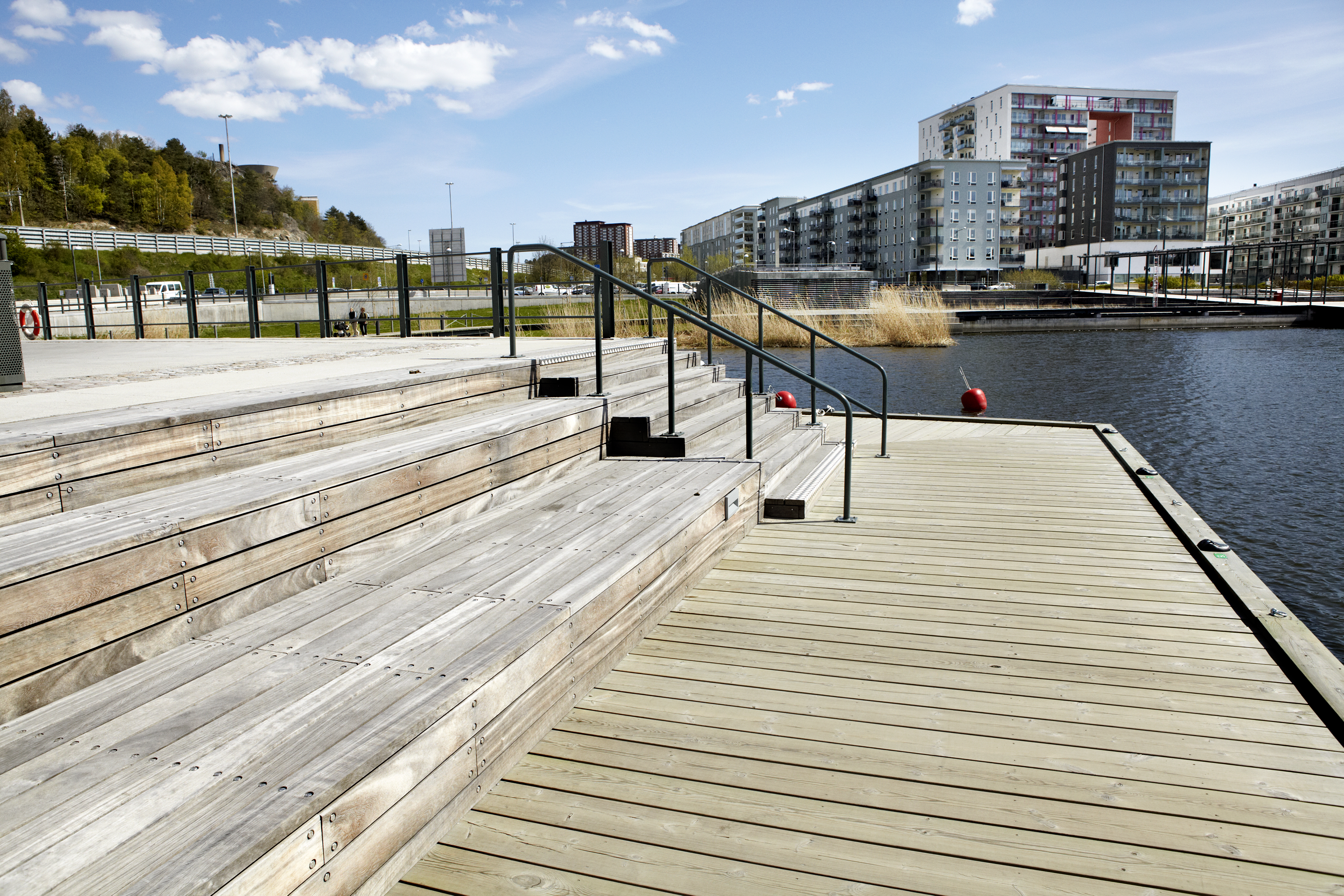 - Beskrivning: Brygga, bänkar, trappor, kaj. Nybyggnation, Hammarby Sjöstad.