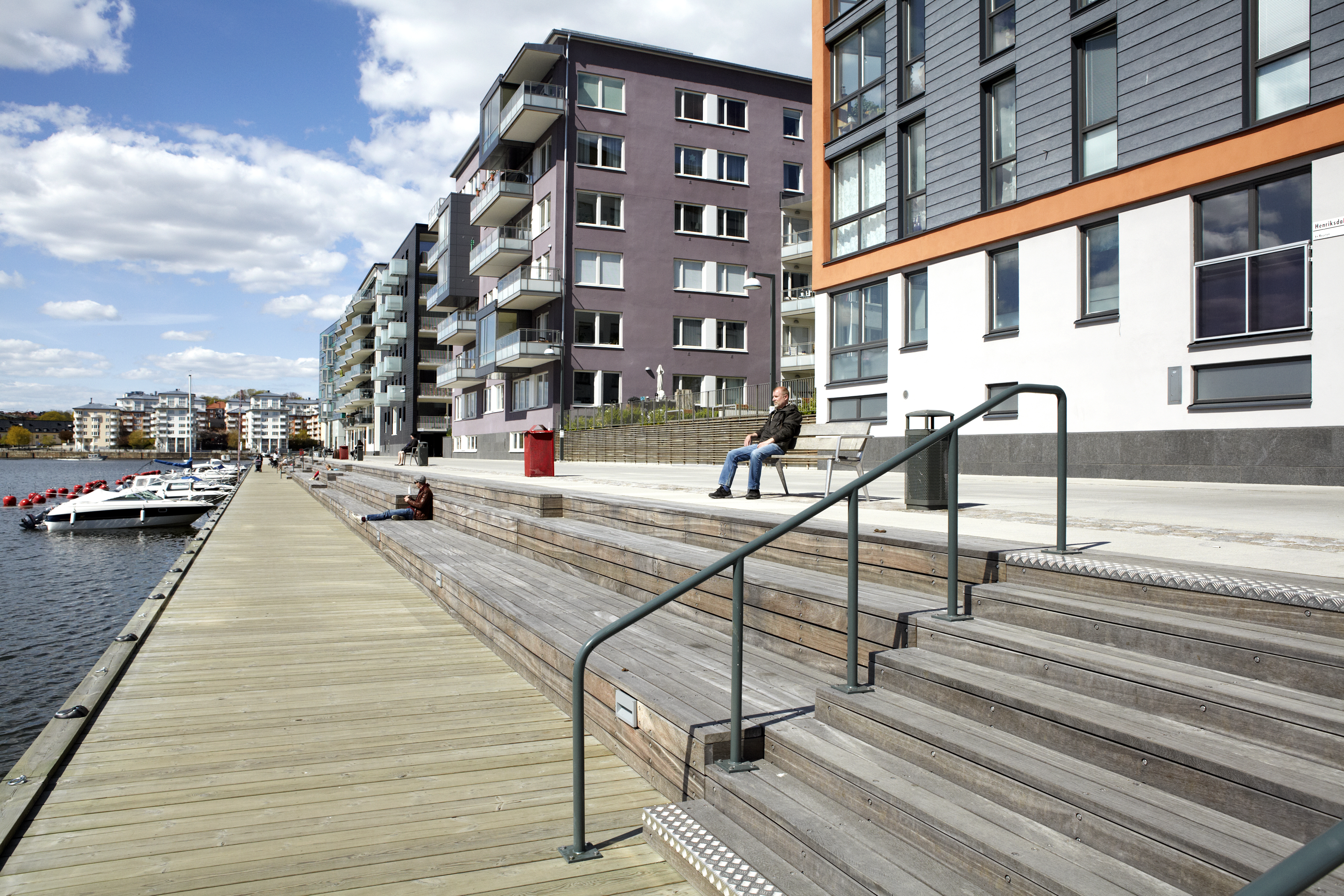 - Beskrivning: Brygga, bänkar, trappor, kaj. Nybyggnation, Hammarby Sjöstad.