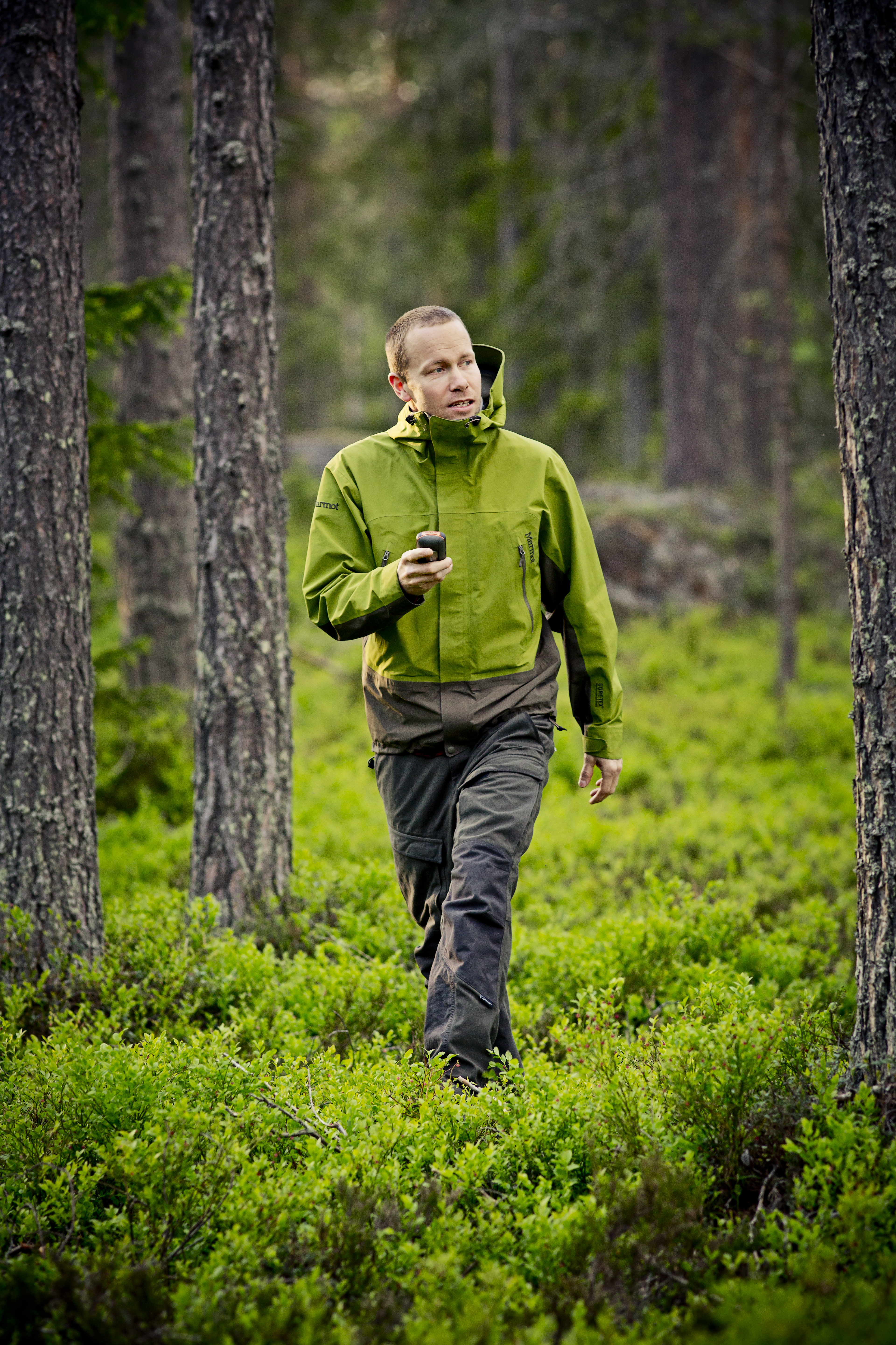 • Beskrivning: Virkesköpare, planerare, skogsägare i skogen med GPS