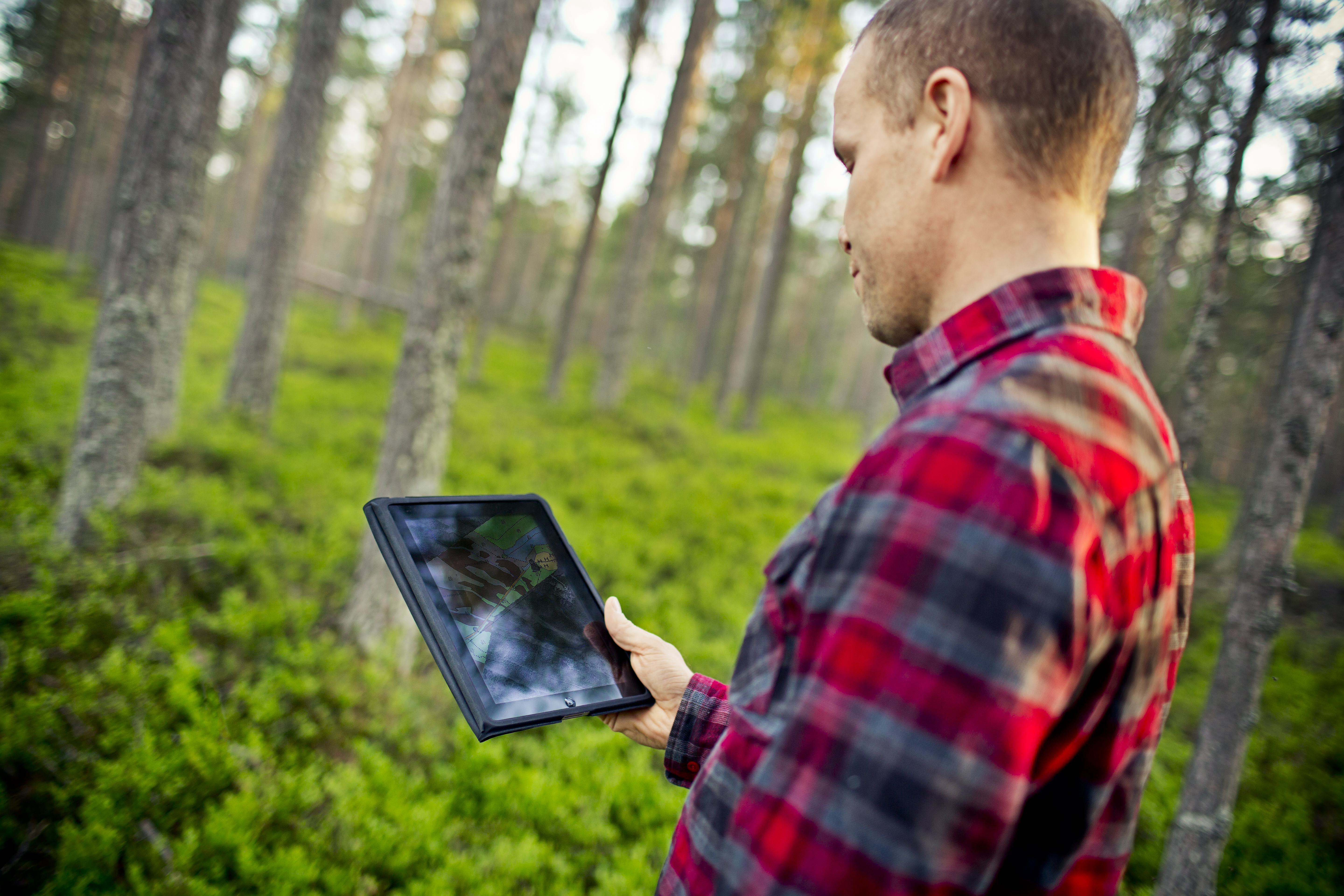 - Beskrivning: Virkesköpare, planerare, skogsägare i skogen med surfplatta, läsplatta, iPad