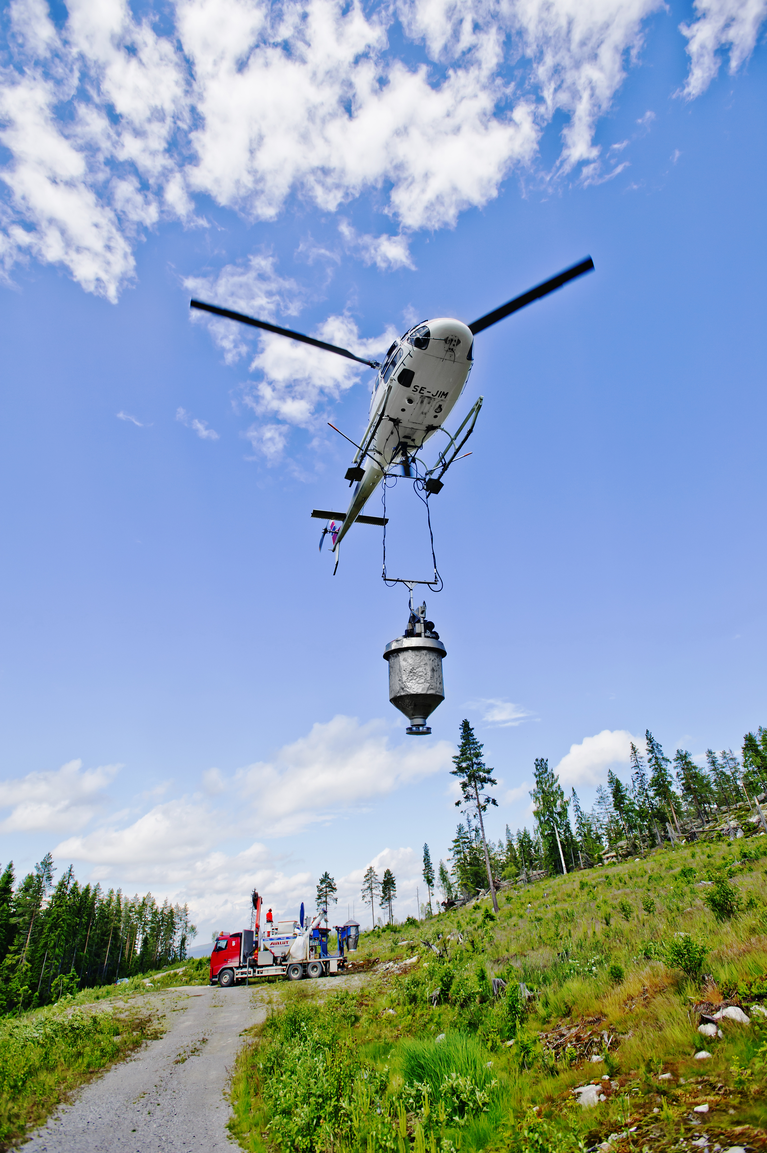 - Beskrivning: Gödsling, skogsgödsling. Airlift Helicopter utför gödsling på Sveaskogs marker.