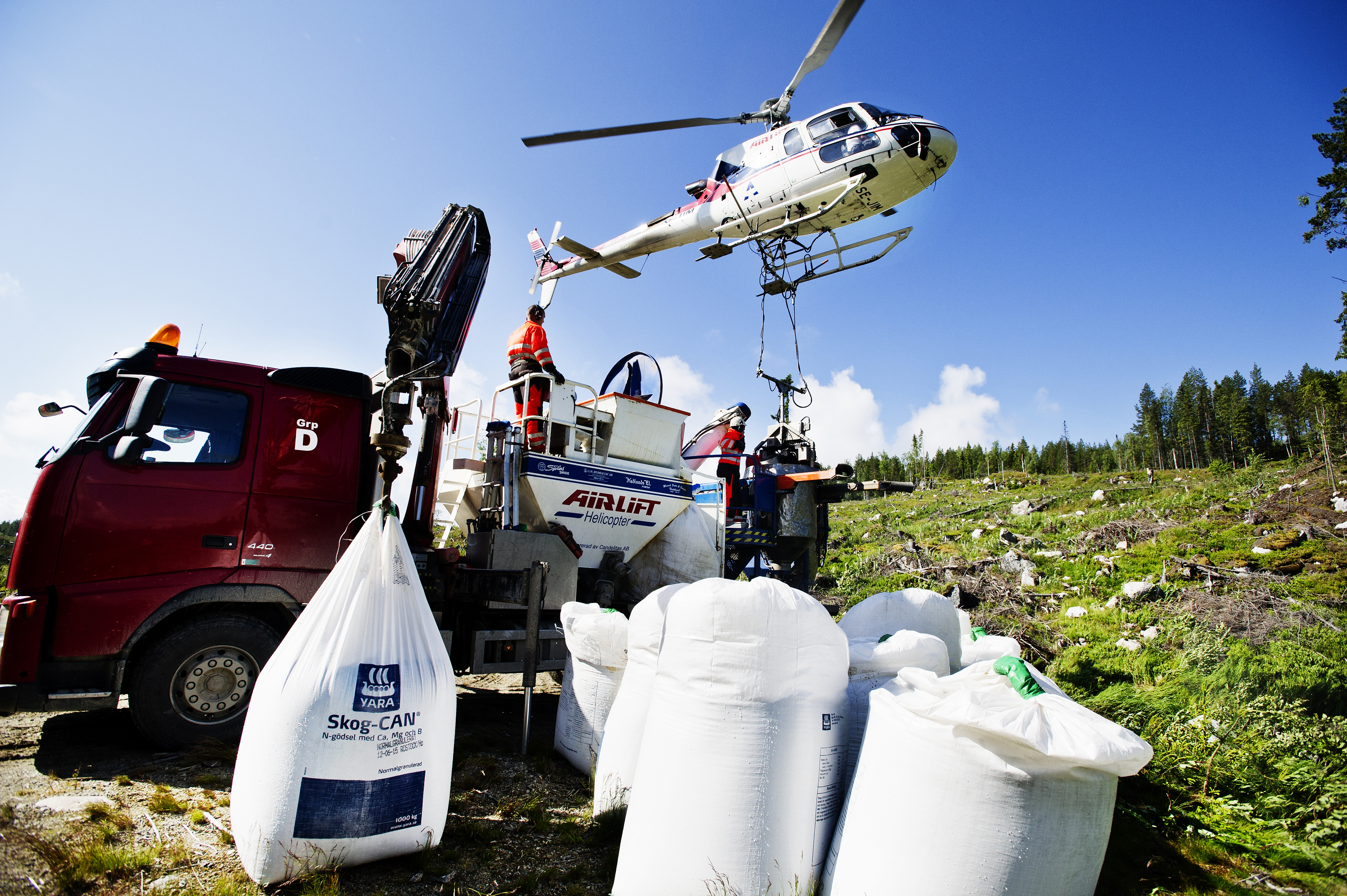 - Beskrivning: Gödsling, skogsgödsling. Airlift Helicopter utför gödsling på Sveaskogs marker.
