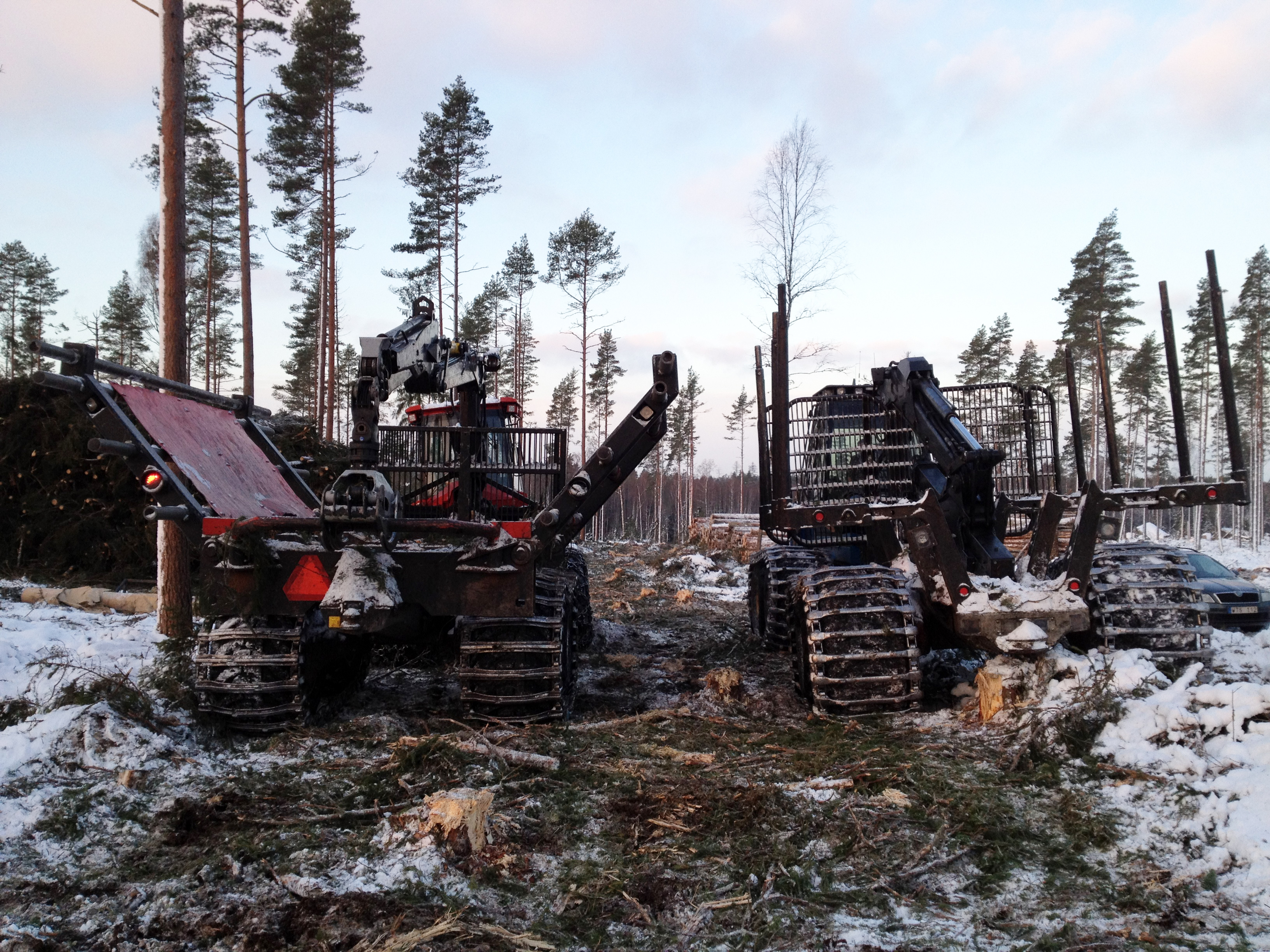 - Beskrivning: Bred basväg i fröställningarna gör att både skördaren och skotaren får ordentligt med plats så de kan köra i fullbredd. Till vänster grotskotare (Valmet 860) med risrede, till höger en Rottne F18 (slutavverkningsskotare).
