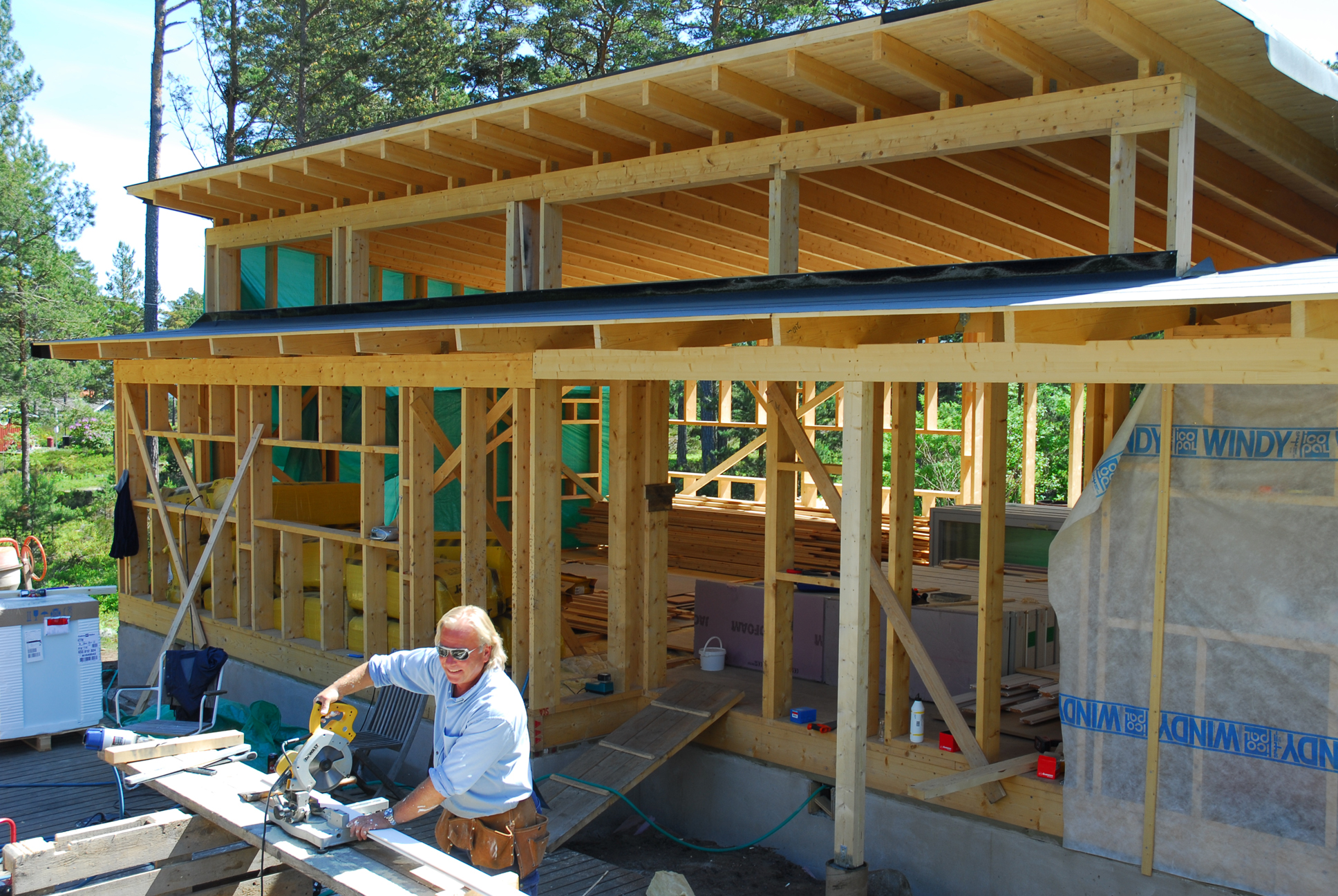 - Beskrivning: Eget hemmabygge av fritidshus, snickare, husbygge, byggplats, trä