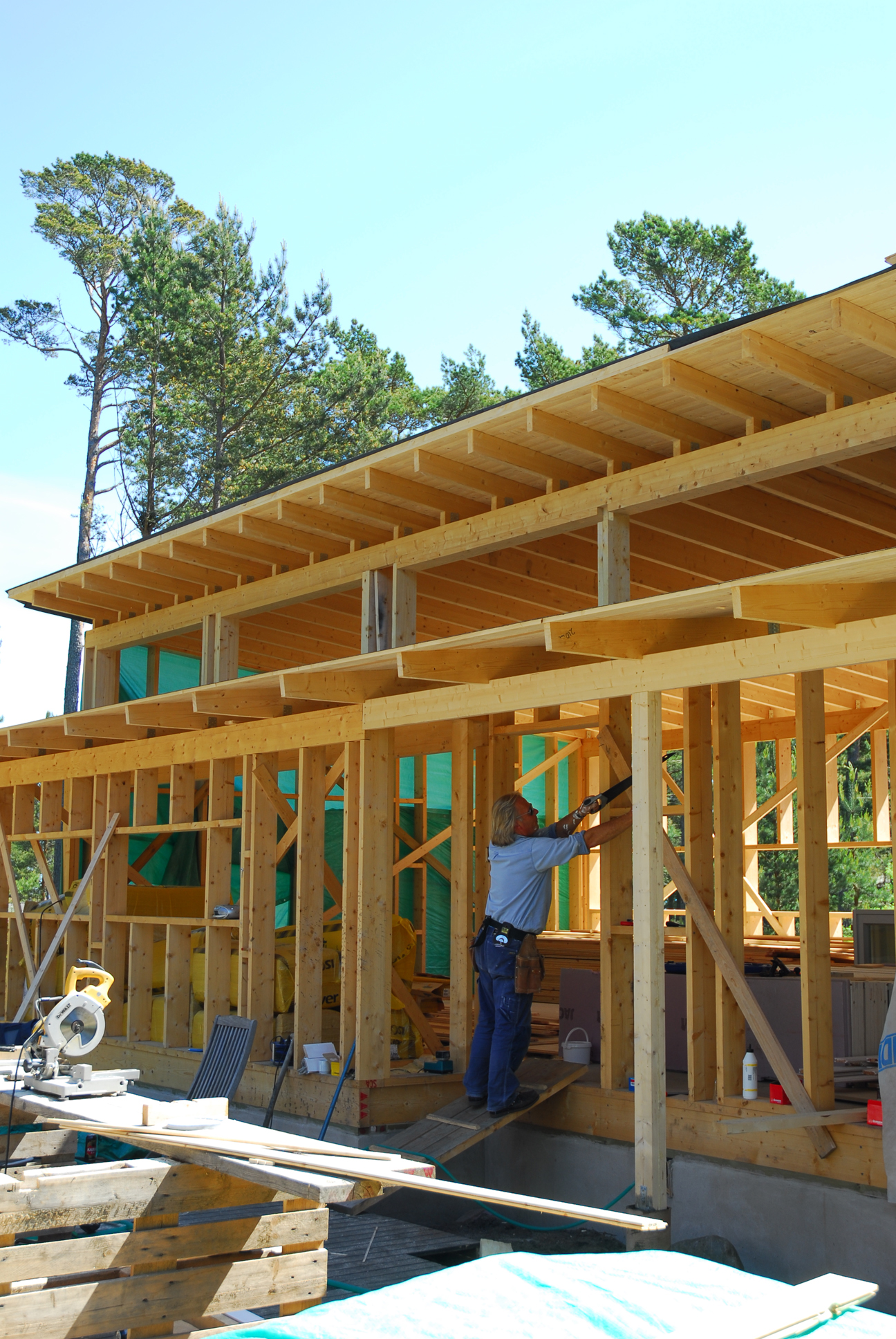 - Beskrivning: Hemmabygge av fritidshus, bygge, husbygge, snickare, trä, byggplats