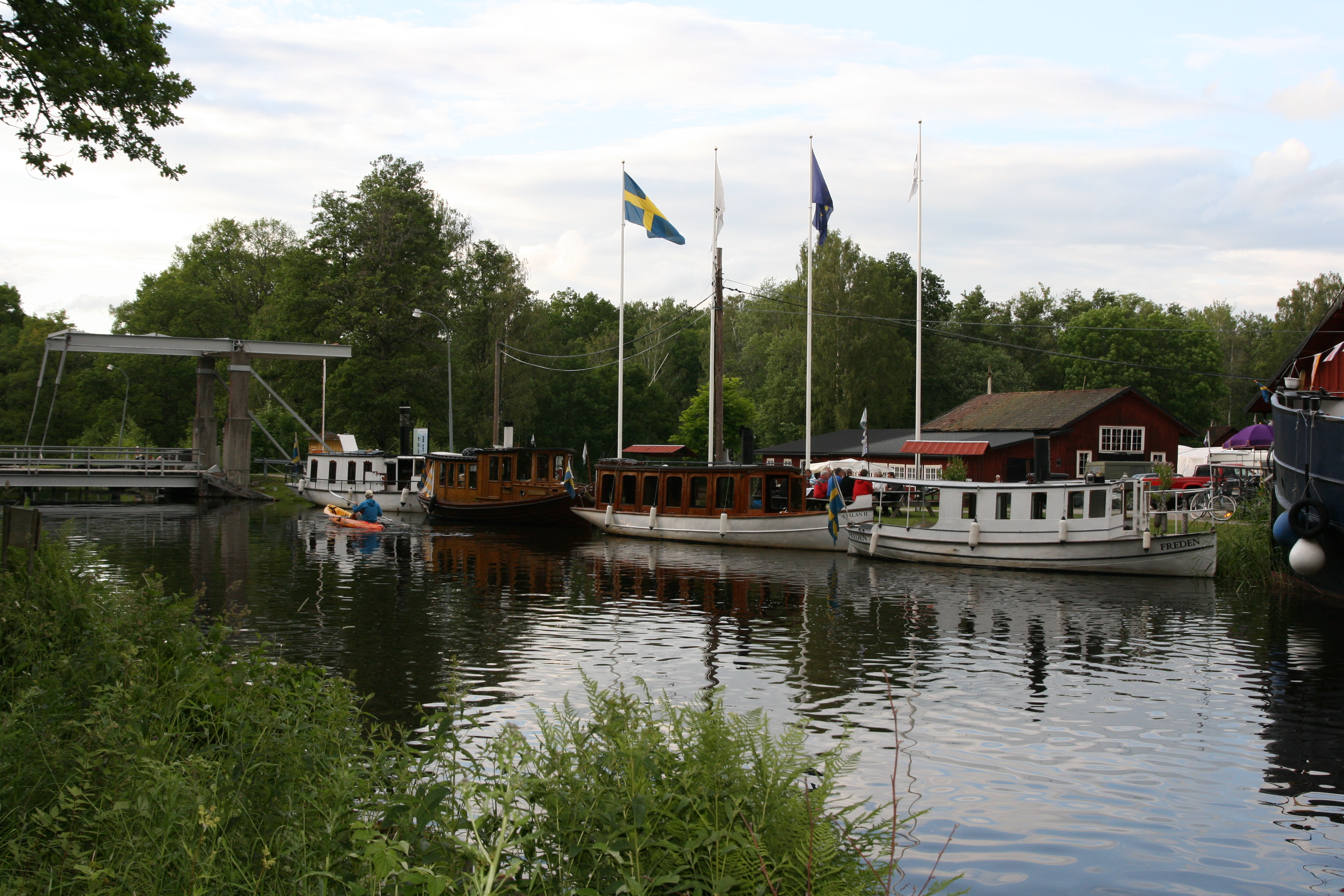 - Beskrivning: Hamn, med flaggor nära café Hjämare dockan Turistbåt på Hjälmare kanal Urban Beijmo