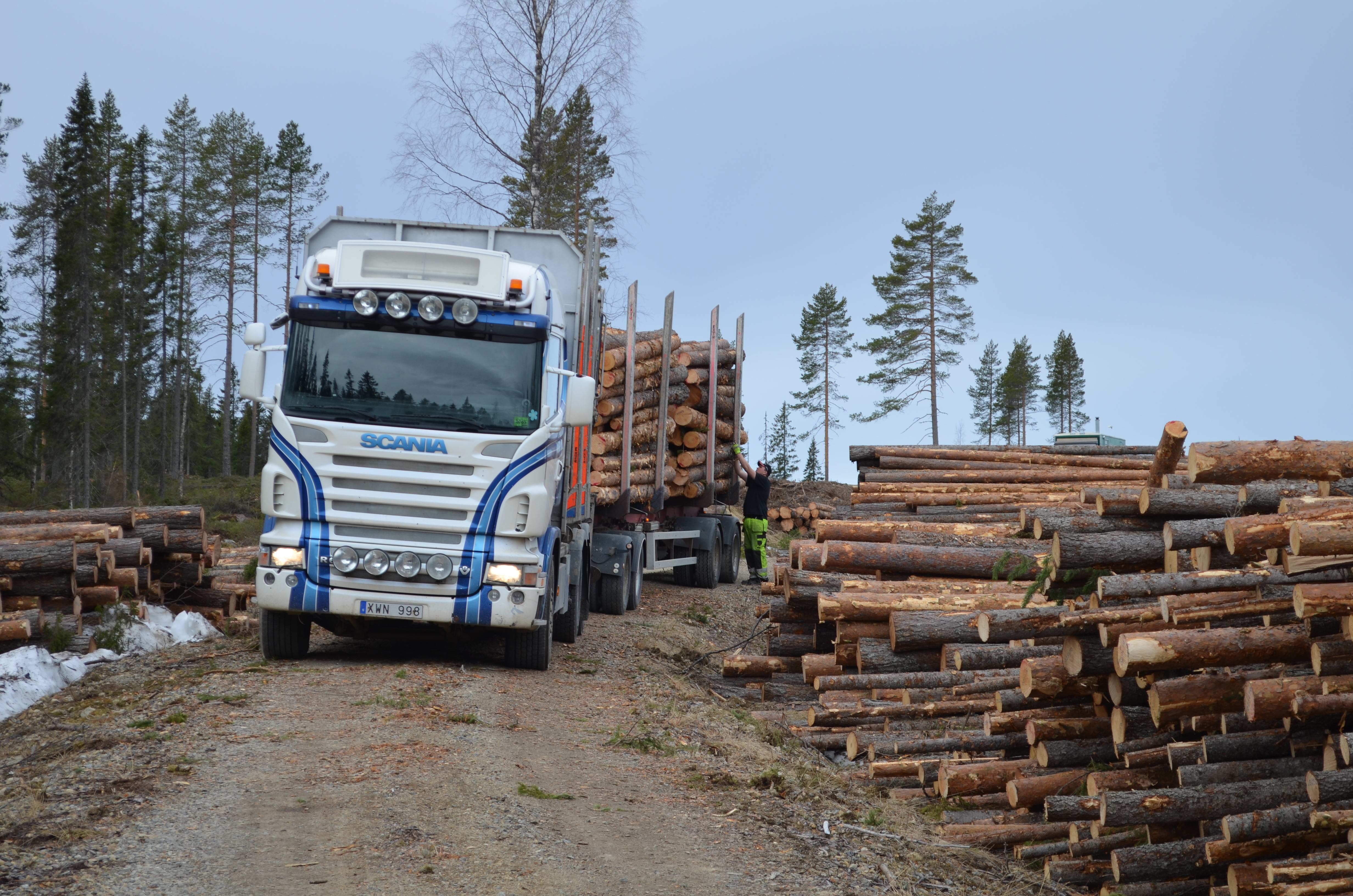 - Beskrivning: logistik, virkesbil, lastbil, leverans, transport, timmertransport, transportering av virke, Brattby såg exkursion, samarbete mellan Sveaskog och Brattby Sågverks AB, trä, produkter och tjänster,