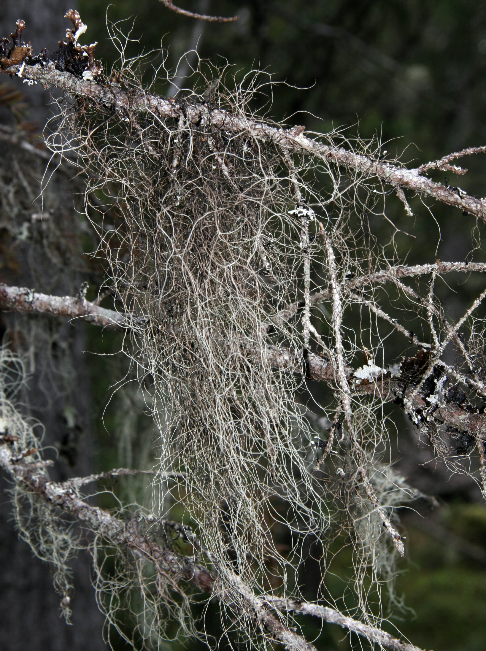 - Beskrivning: Bryoria nadvornikiana, lav hängandes från trädgrenar