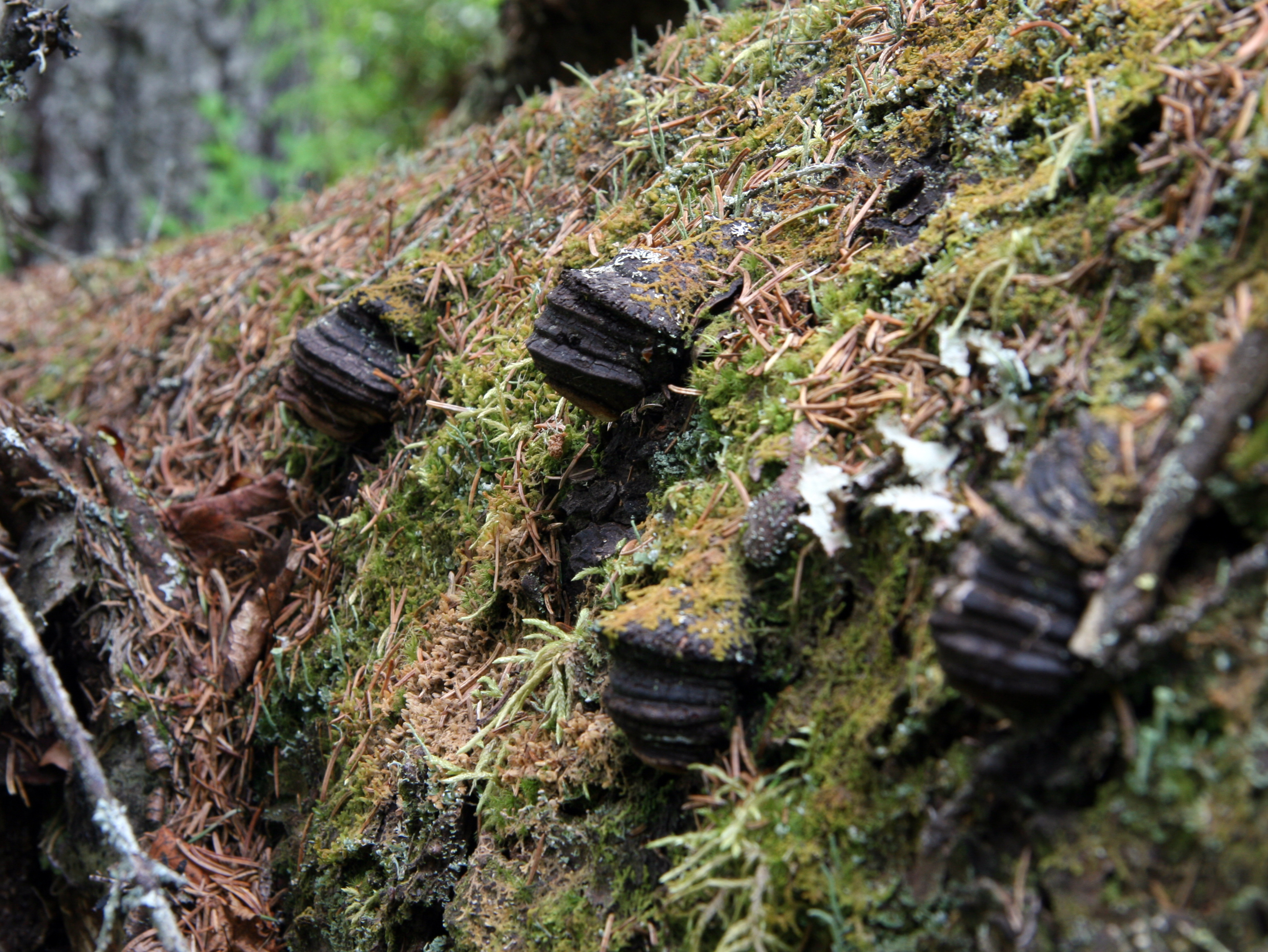 - Beskrivning: Fomitopsis rosea i mossa, Svamp, fungi, svampdjur, spongier, ticka