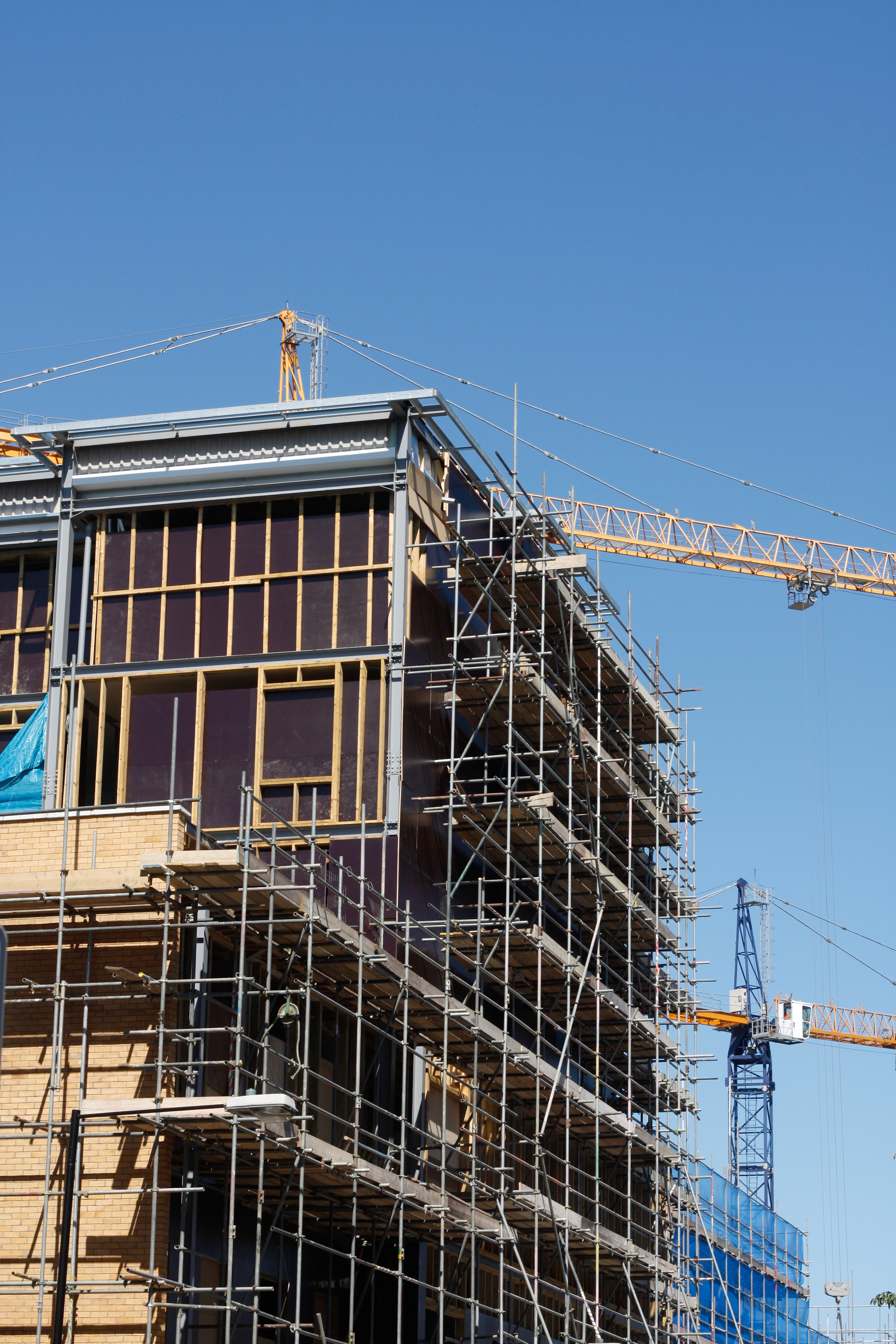 - Beskrivning: Byggställning av metall, metallrör, konstruktion, byggnation, slutprodukt av träråvara, virke, hus, byggnad, bostad, höghus
