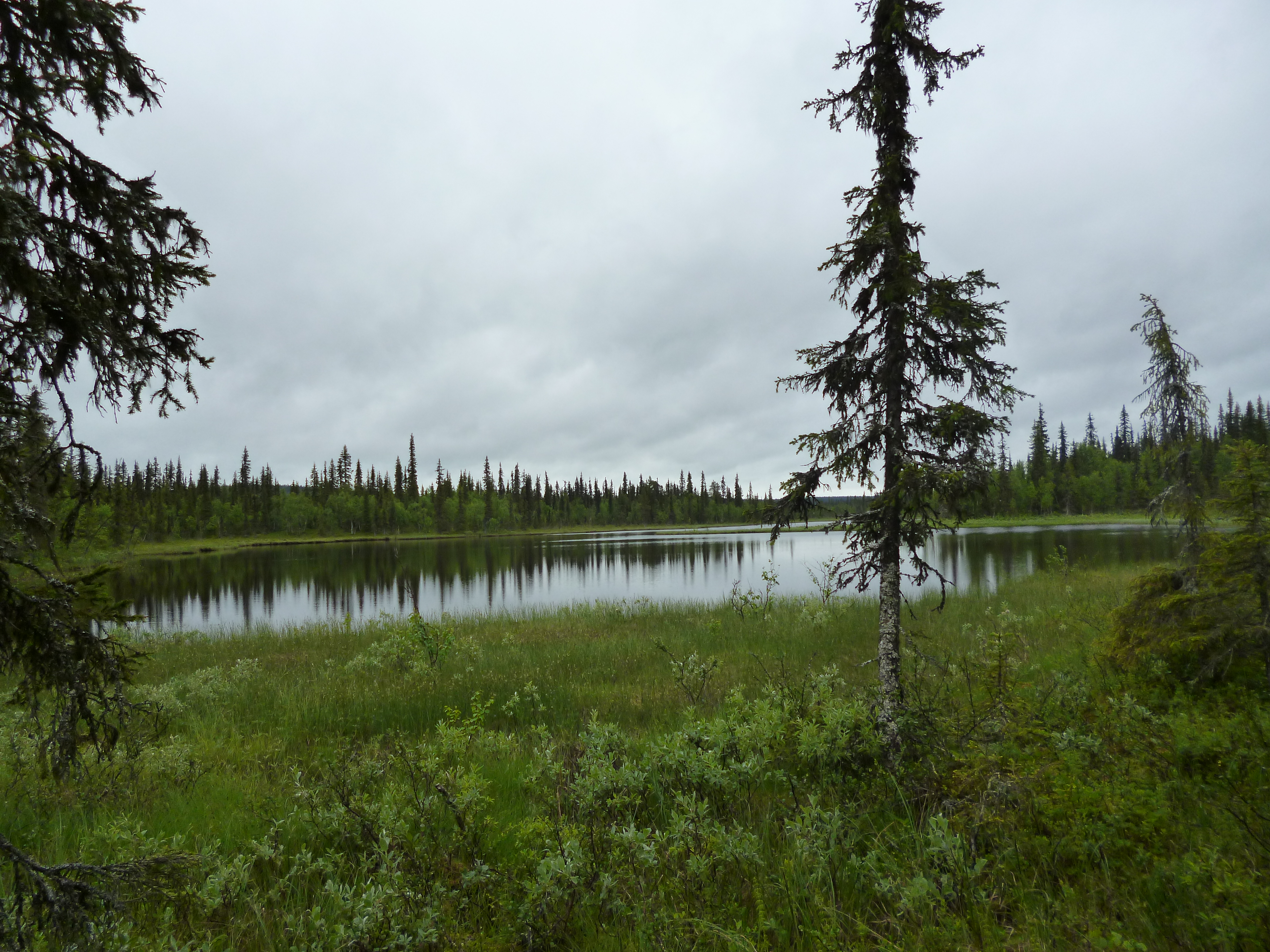 - Beskrivning: Ekopark Karhuvaara, tjärn, skogstjärn, landskap, spegling, spegelblank, sjö, vatten, träd, mulet, dyster