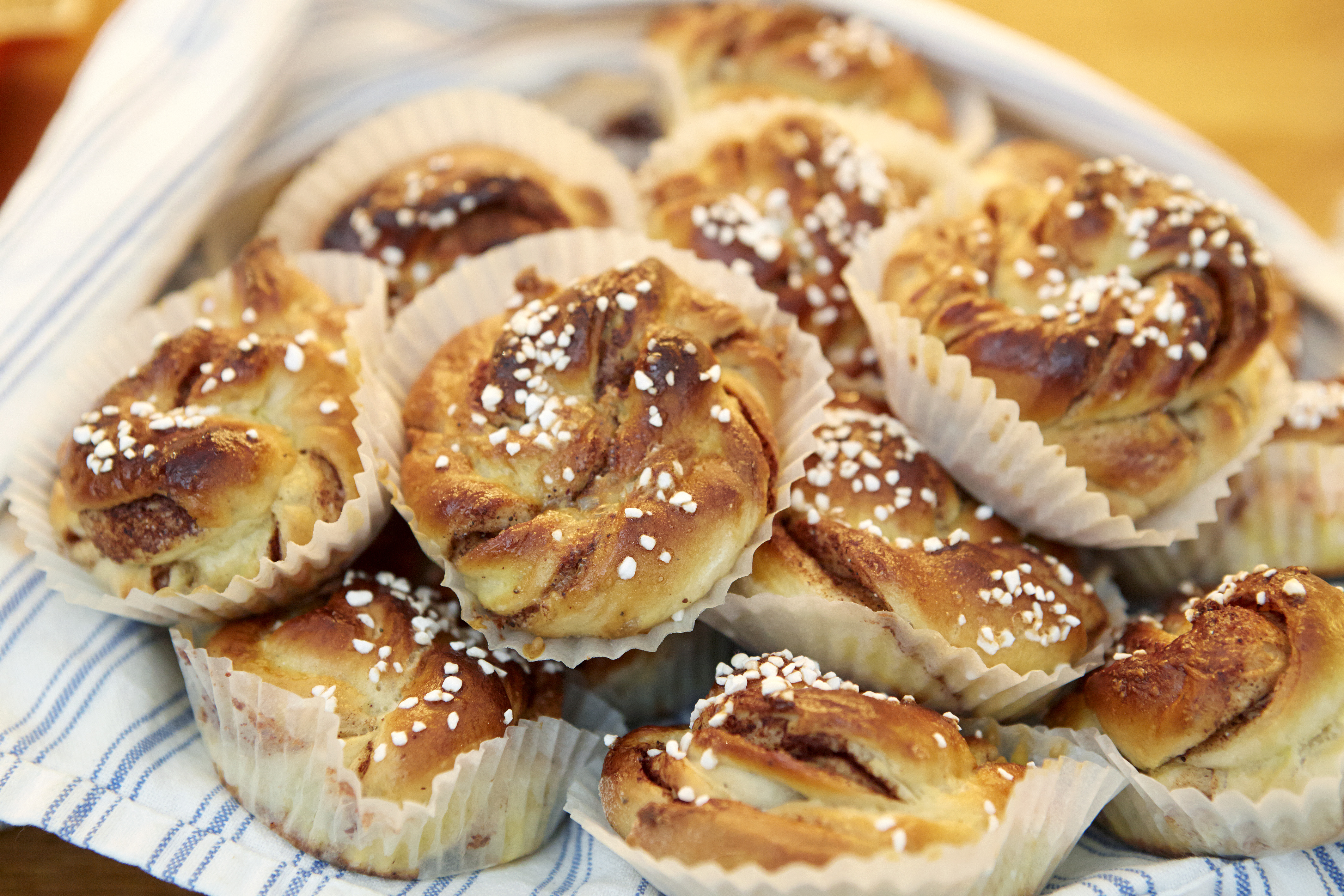 - Beskrivning: Färdiga bullar liggandes på duk, Bullbak, greaseproof-papper, fettresistent papper, formar, bullar, matlagning, slutanvändning av träråvara, produkter, papper