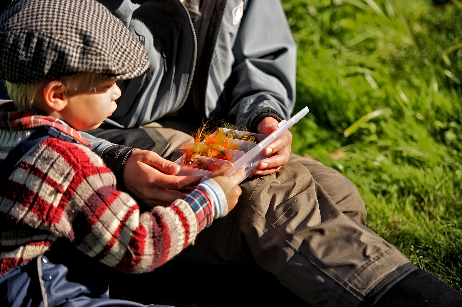 • Beskrivning: barn, pojke inspekterar fiskedrag, flugor, krokar med sin förälder