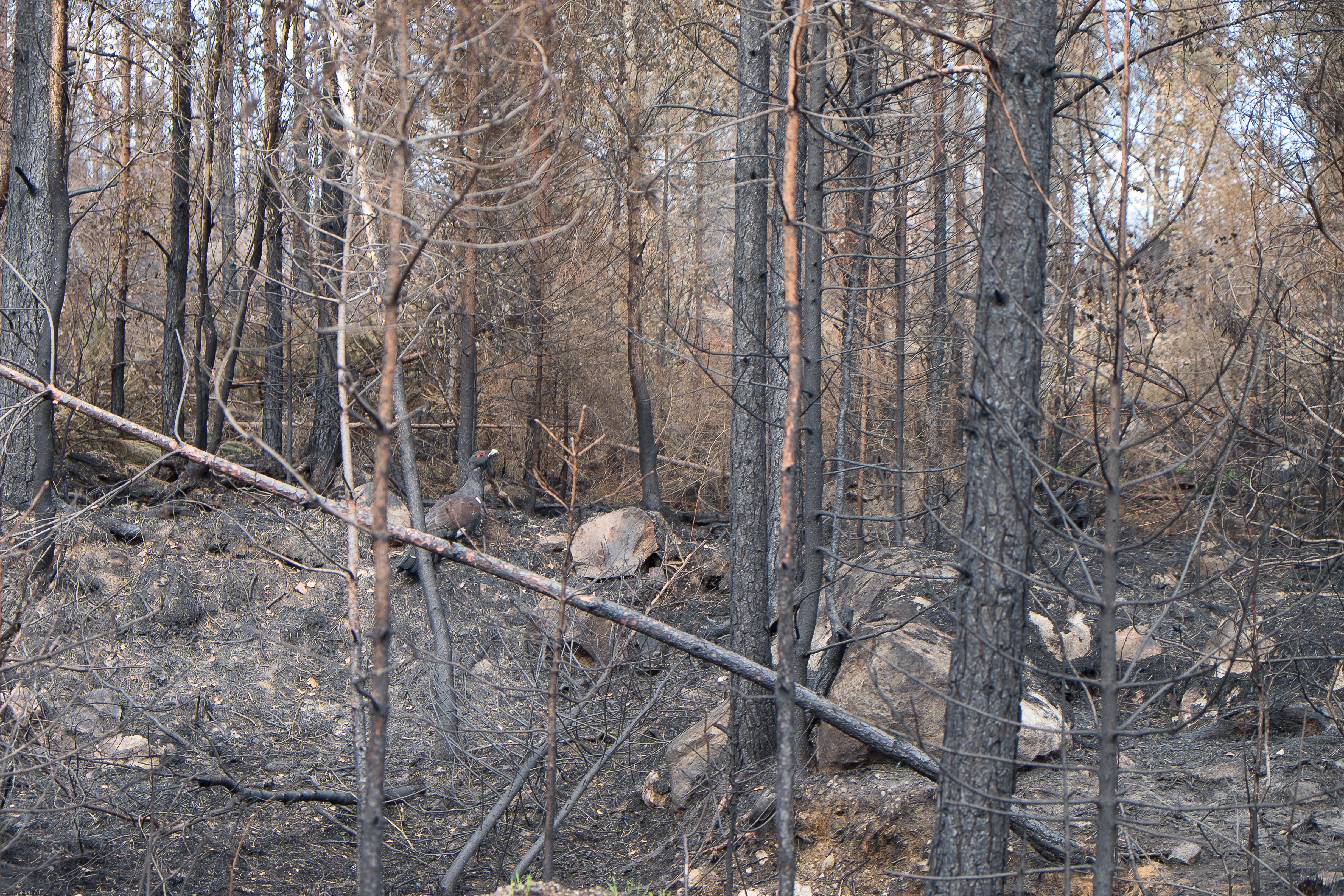 - Beskrivning: Nedbrunnen skog och en tjäder, fågel, skogsbrand, Västmanland, brandskadad