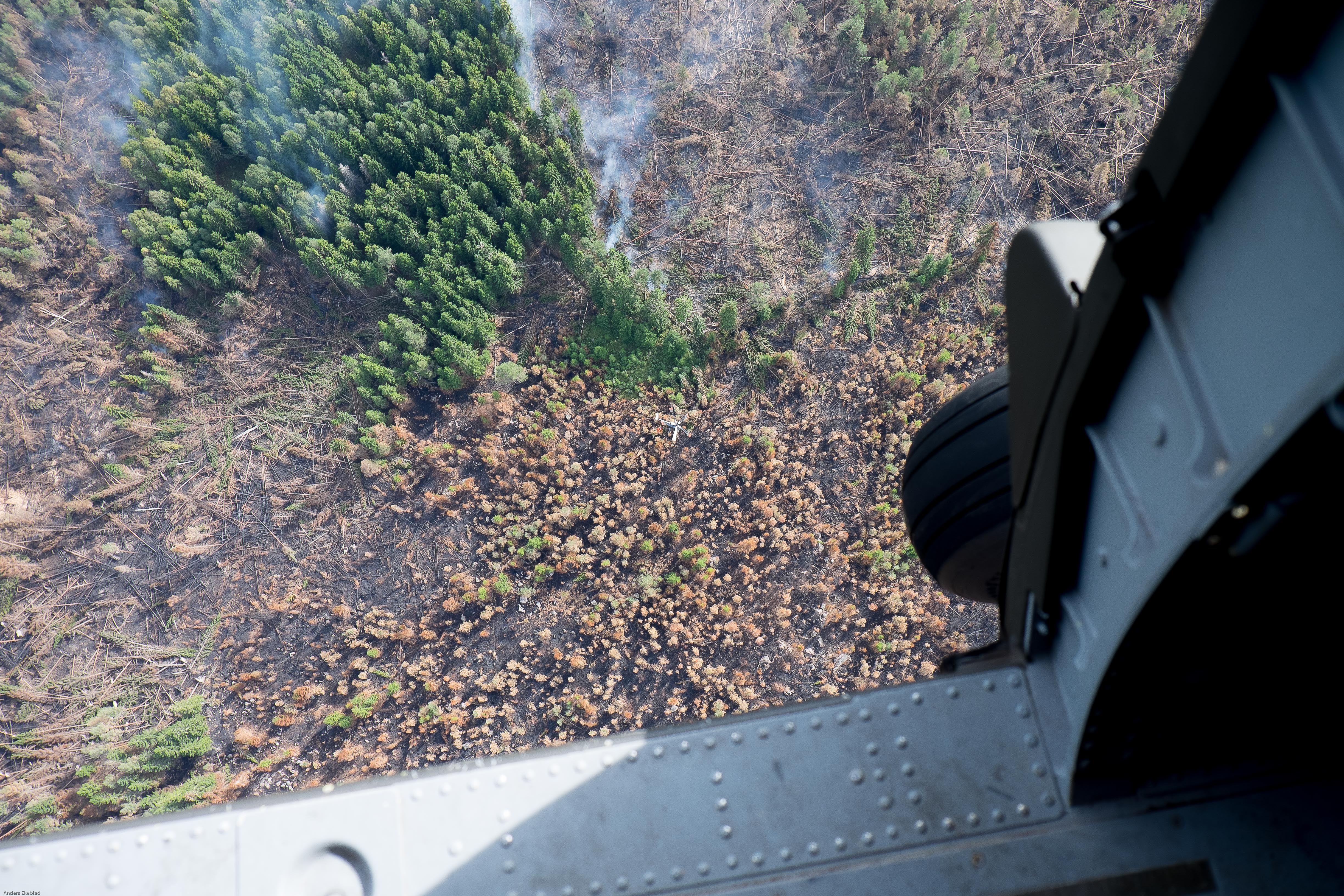 • Beskrivning: Skogsbrand, skog, Västmanland, nedbrunnen skog, brandskadad, ovanifrån, flygfoto, rök