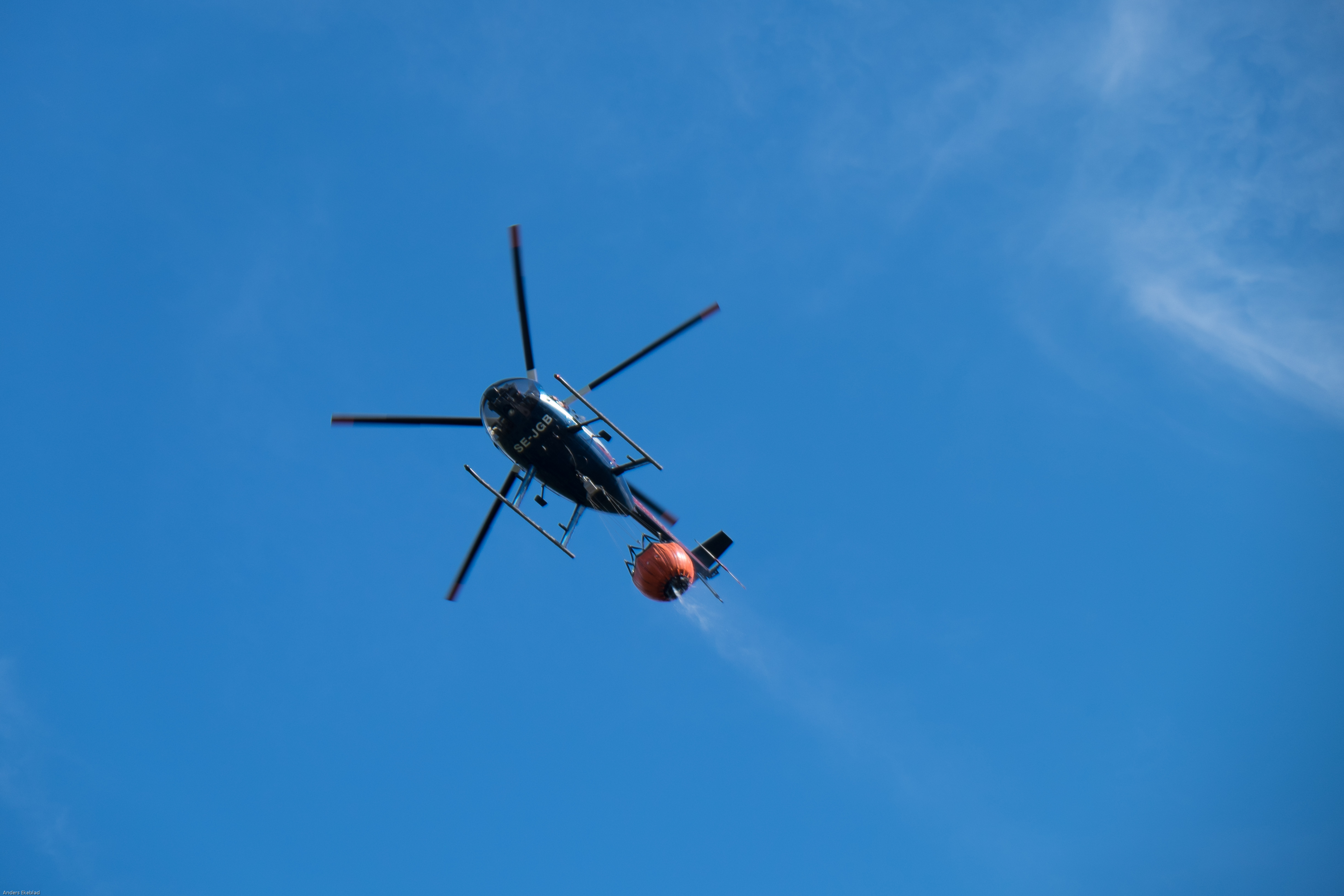 • Beskrivning: Skogsbrand, skog, Västmanland, helikopter underifrån, vatten, vattenbombning, släckning