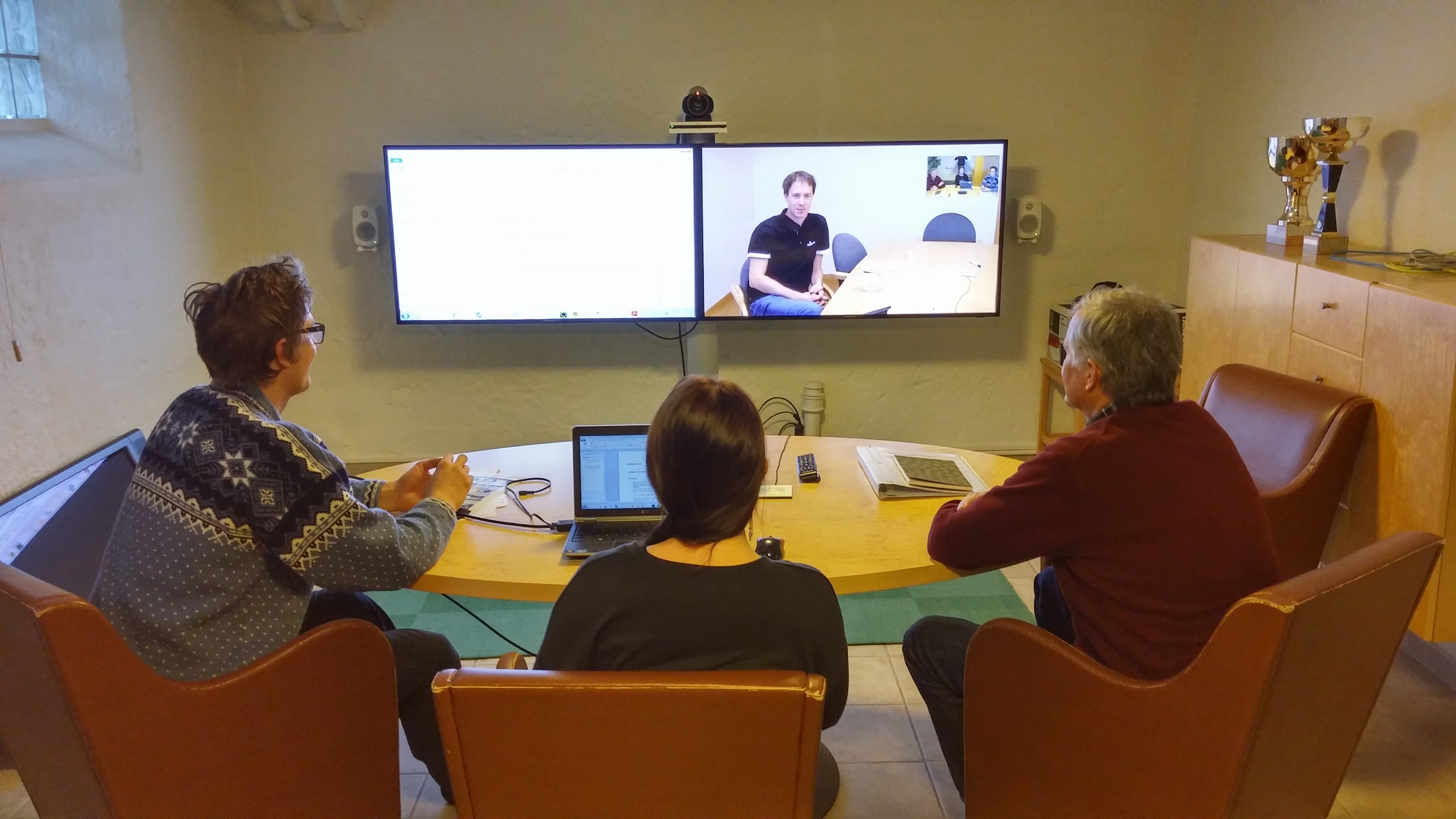 - Beskrivning: Möte, onlinemöte, videomöte, videorum, kamera, telefon, lync, Johan Lundbäck, Maria Lindvall, Hans Winsa. (Killen på skärmen heter Johan Flodström)