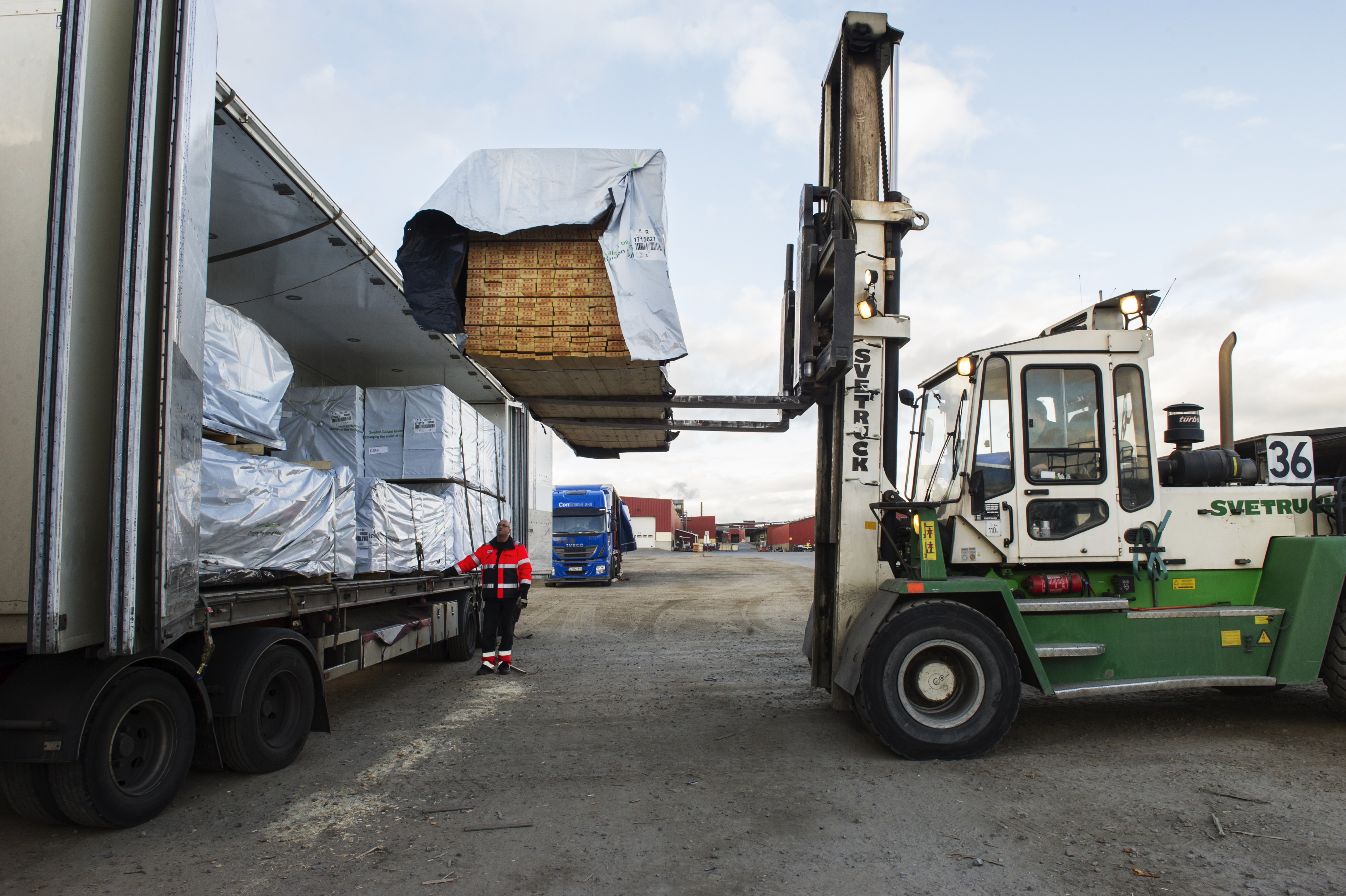 • Beskrivning: Virke lastat för transport, Jutos, timmerbil, lastbil, virkeslager