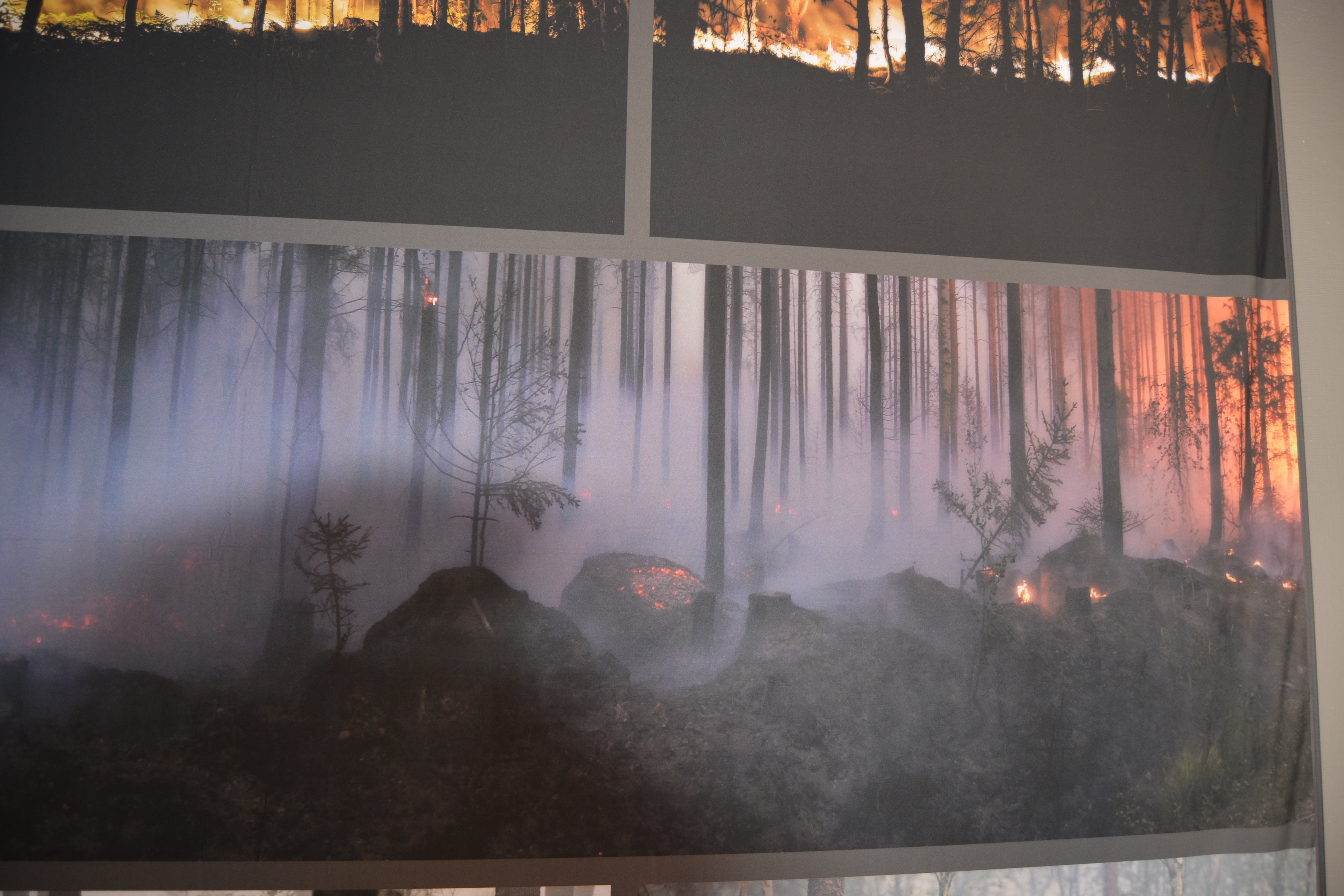 - Beskrivning: Bilder på väggen, Besökscentrum, informationscentrum, Besökscenter Elden & Skogen i Ramnäs, för att visa vad som händer efter en skogsbrand, process, information, skogsbrand