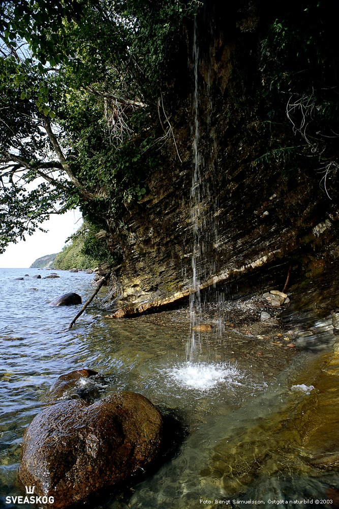 - Beskrivning: Storpissan mynnar i Vätterns branter, Storpissans naturreservat. Vattenfall mot bergvägg, Ekopark Omberg