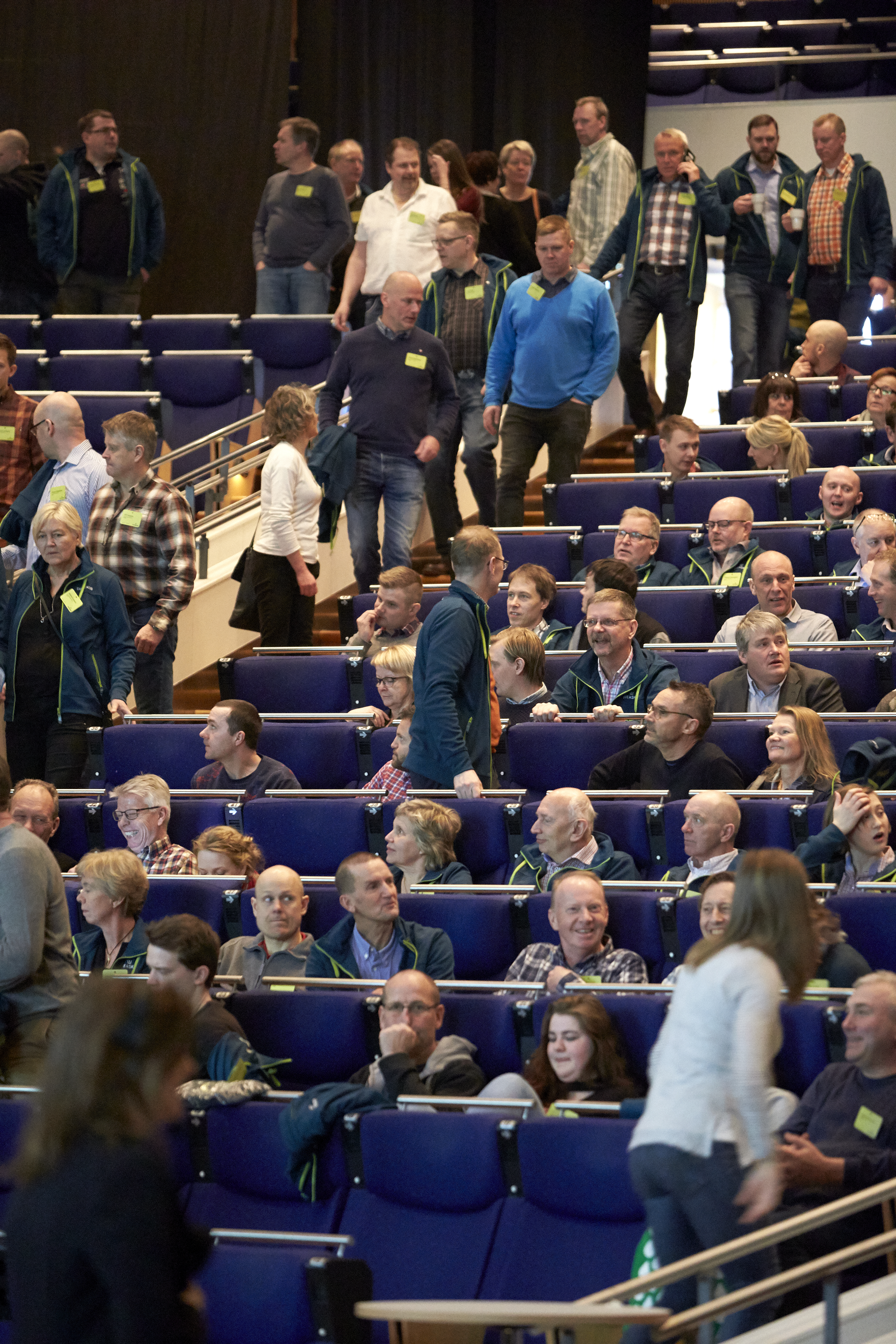 - Beskrivning: Medarbetare som hittar sina platser under Sveaskogsdagarna 2017, dialog, möte, hela företaget samlat, expo, samtal, publik, läktare