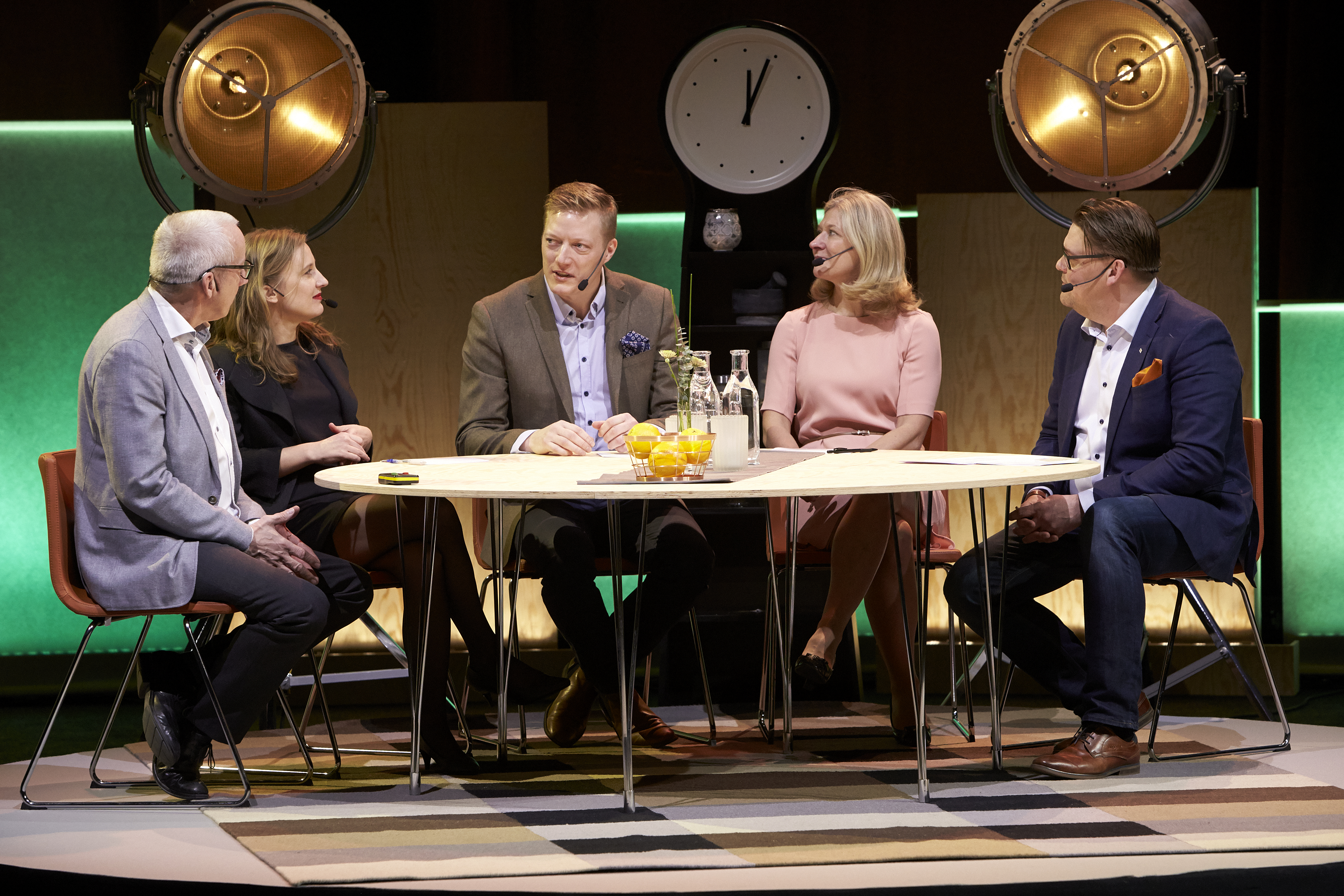 - Beskrivning: Lena Bruce, Roger B Johansson, Inger Thorén Emilsson, Ola Söderdahl, dialog, möte, konversation, Sveaskogsdagarna 2017, panel, dialog, möte, hela företaget samlat, expo