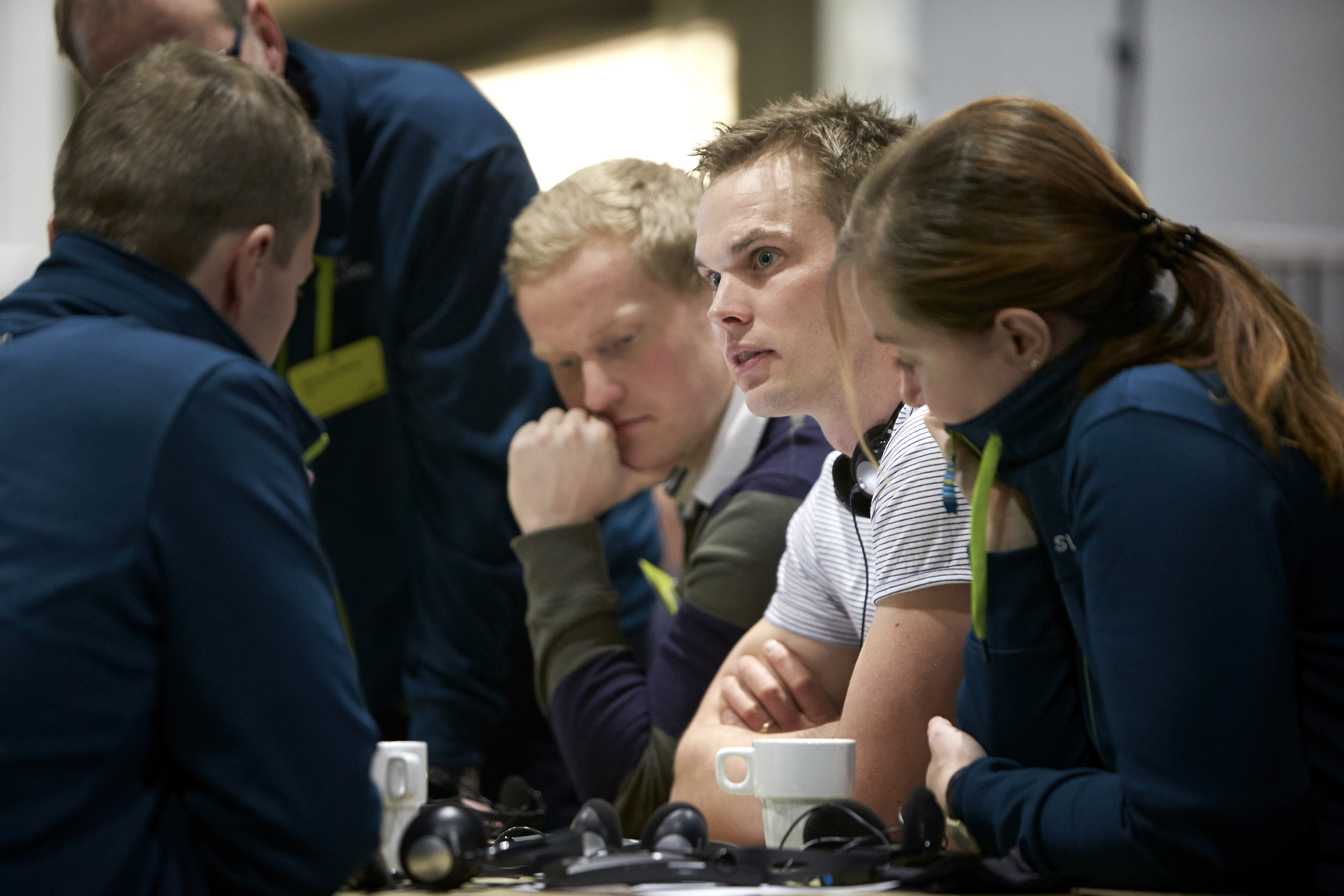 - Beskrivning: Team building, möte, konversation, gemenskap, problemlösning, samlade kring surfplatta, tablet, platta, hörluar, grupp, grupparbete, Sveaskogsdagarna 2017, dialog, möte, hela företaget samlat, expo