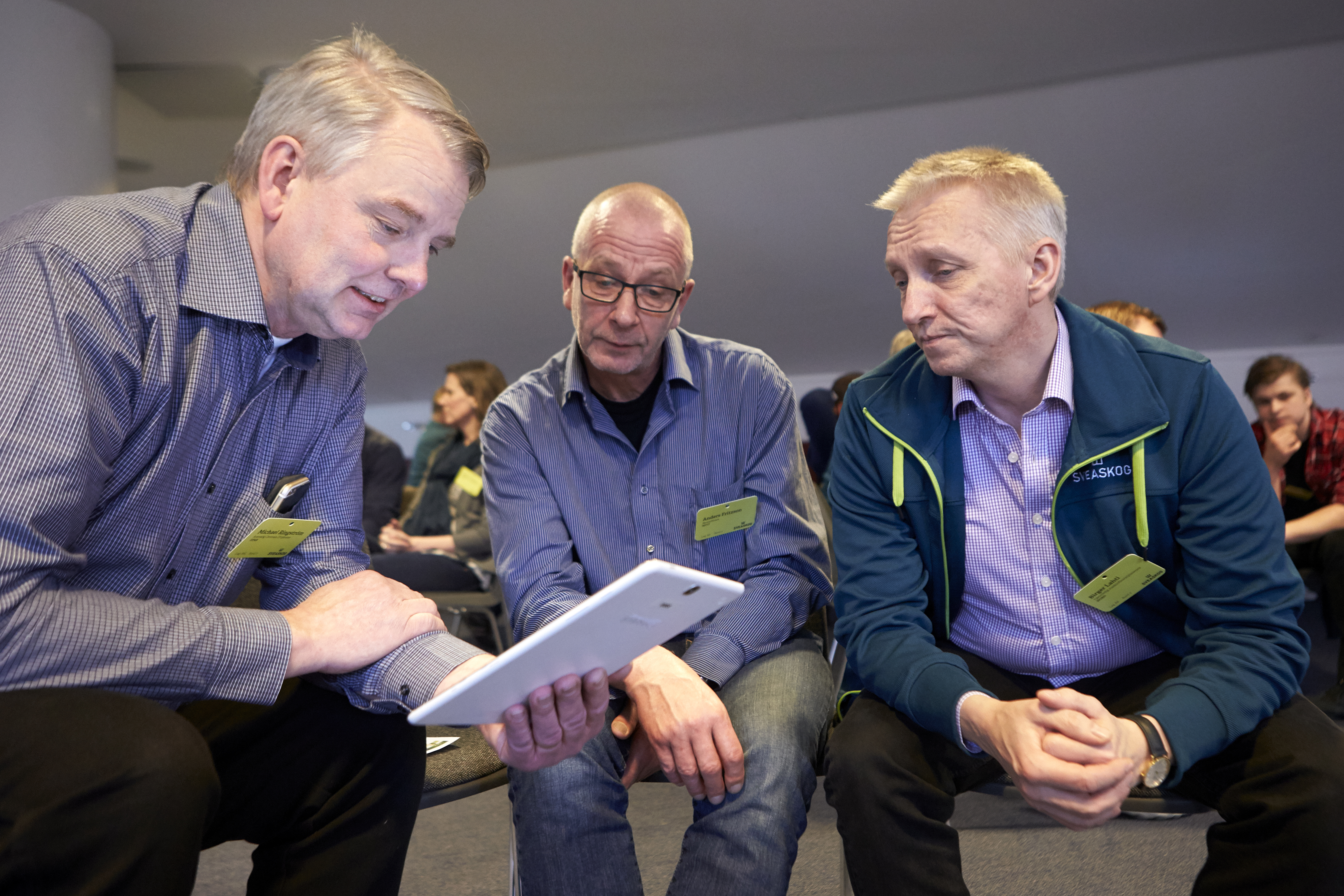 - Beskrivning: Michael Ringström, Anders Fritzon och Birger Lahti, Kolla på video, app, Gruppövning, grupparbete, team building, uppgift, problemlösning, platta, tablet, surfplatta, Sveaskogsdagarna 2017, dialog, möte, hela företaget samlat, expo, gemenskap