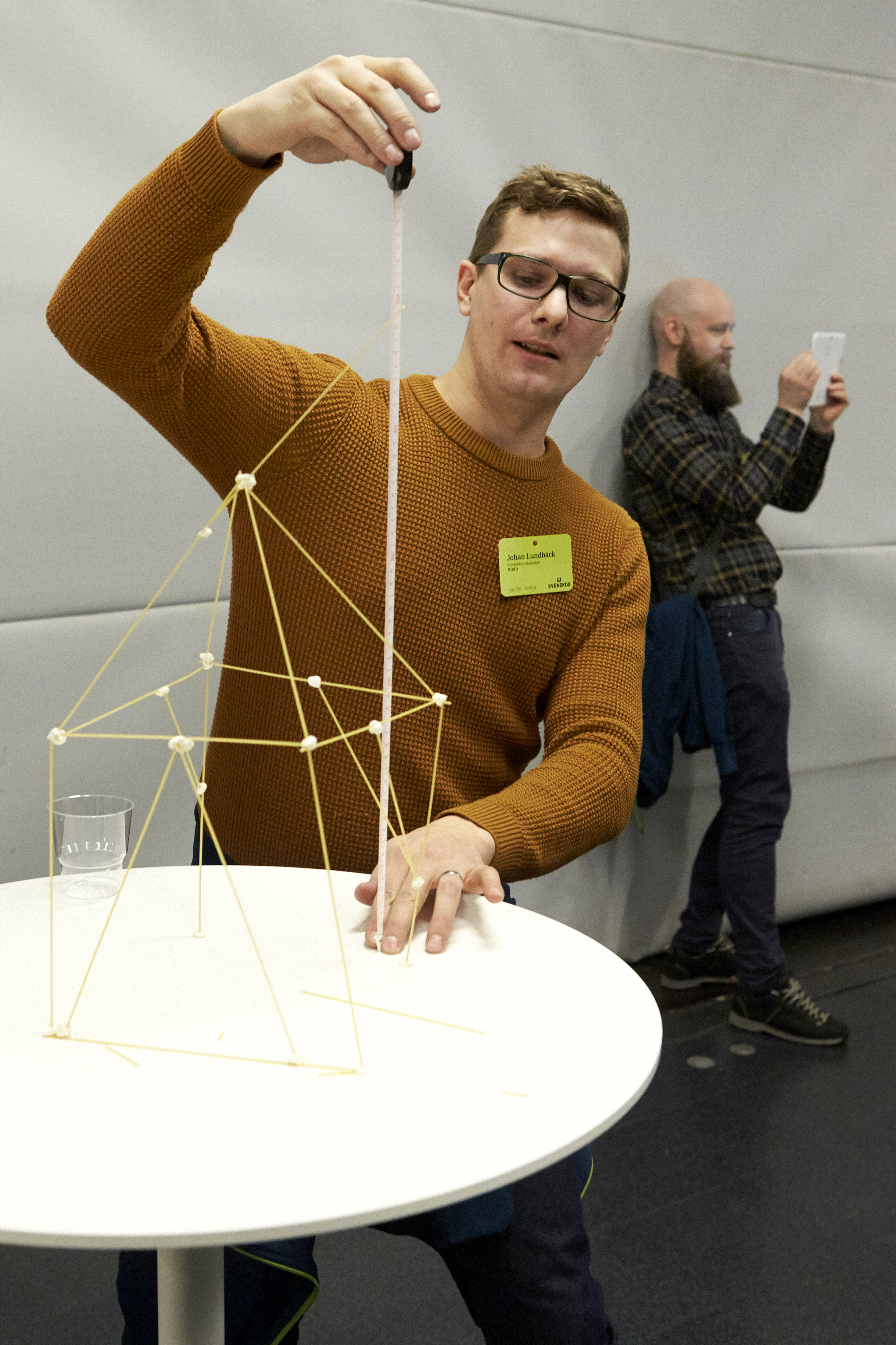• Beskrivning: Johan Lundbäck mäter hur högt spagettihuset blev, måttband, Station, uppgift, bygga med spaghetti, hållbarhet, gruppövning, team building, Sveaskogsdagarna 2017, dialog, möte, hela företaget samlat, expo, tävling
