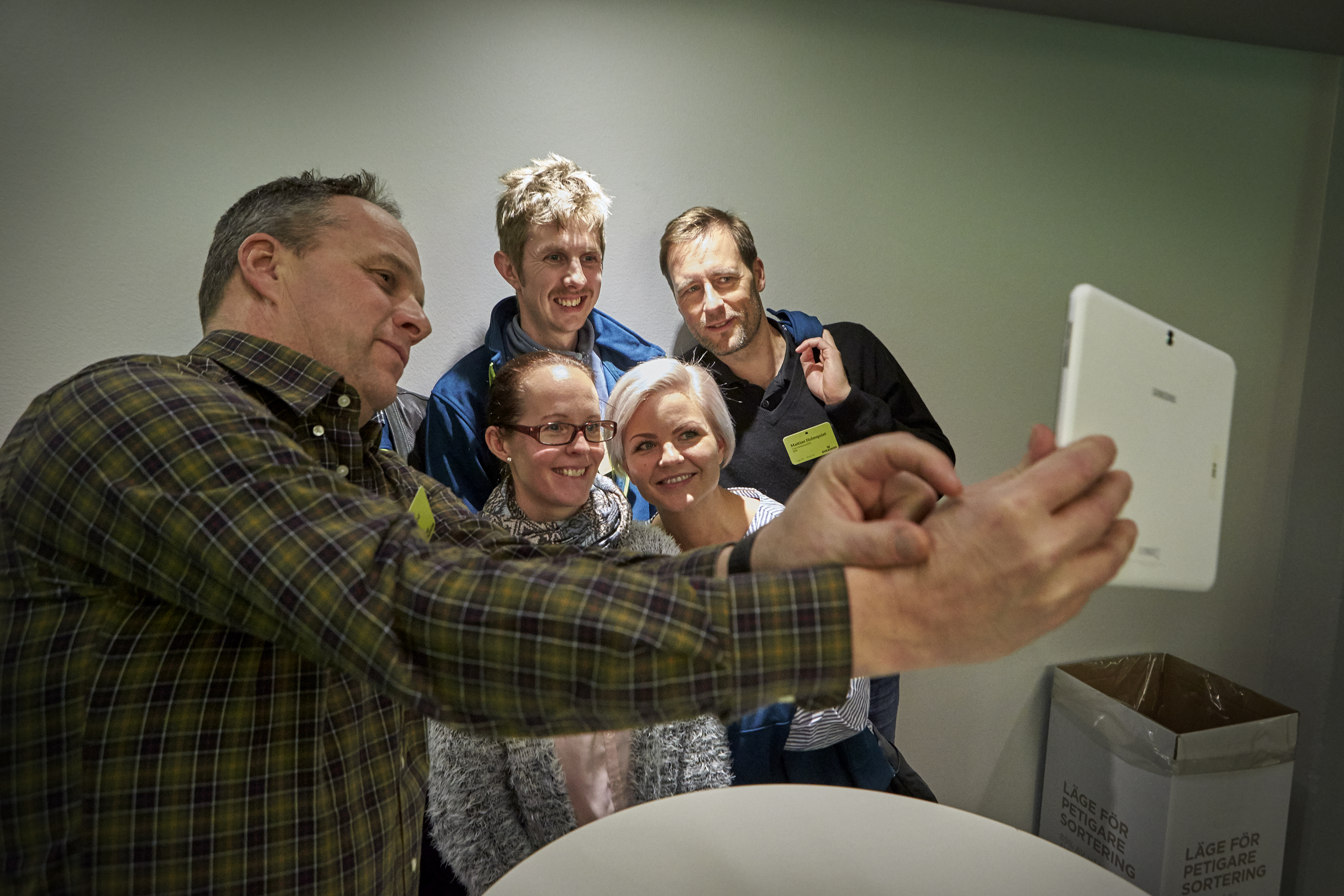 - Beskrivning: gruppövning, team building, gruppbild, foto, Sveaskogsdagarna 2017, dialog, möte, hela företaget samlat, expo, station, selfie
