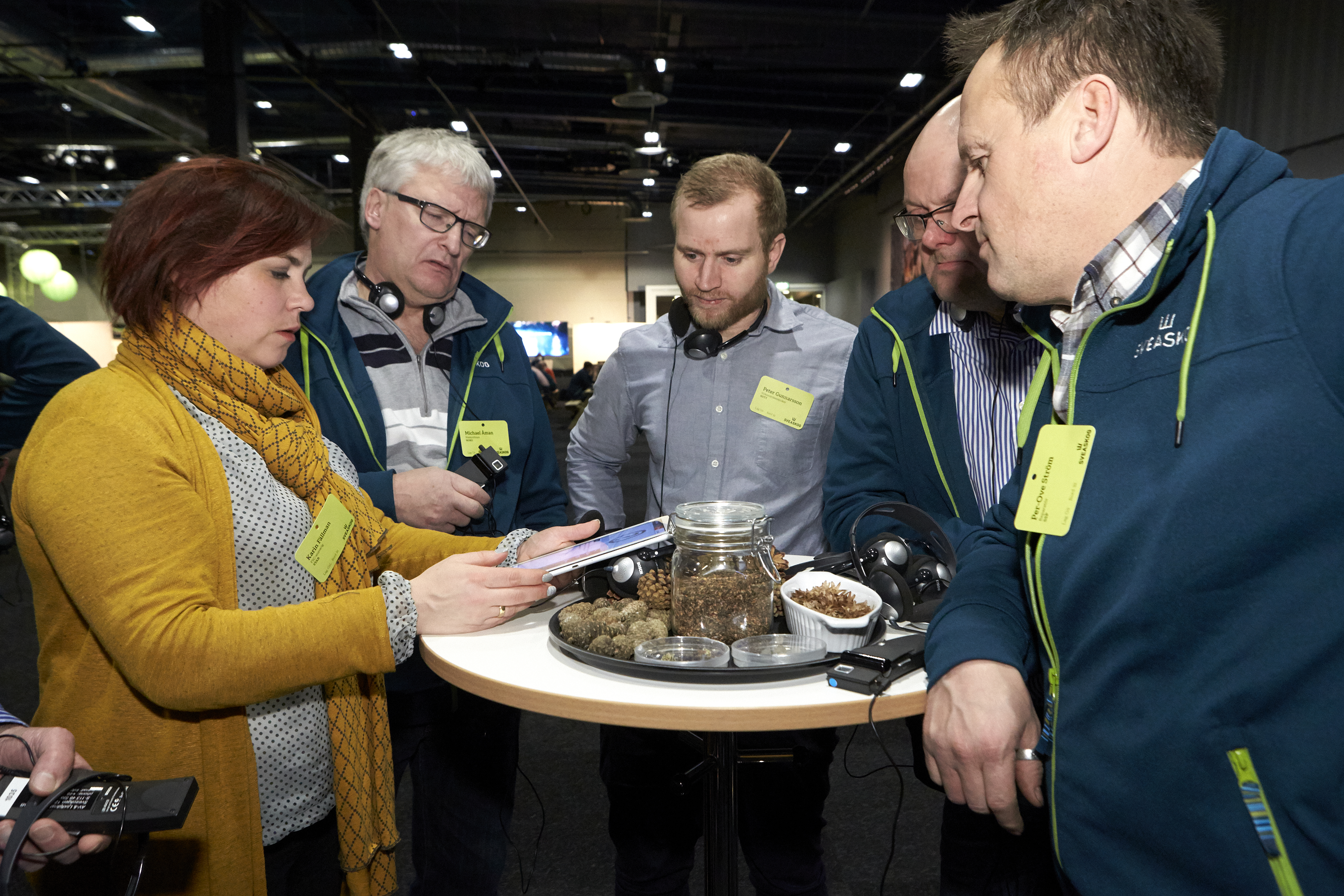 • Beskrivning: Karin Fällman, Michael Åhman, Peter Gunnarsson och Per-Ove Ström, med flera, gruppövning, grupparbete, team building, samlade runt platta, surfplatta, tablet, Sveaskogsdagarna 2017, dialog, möte, hela företaget samlat, expo