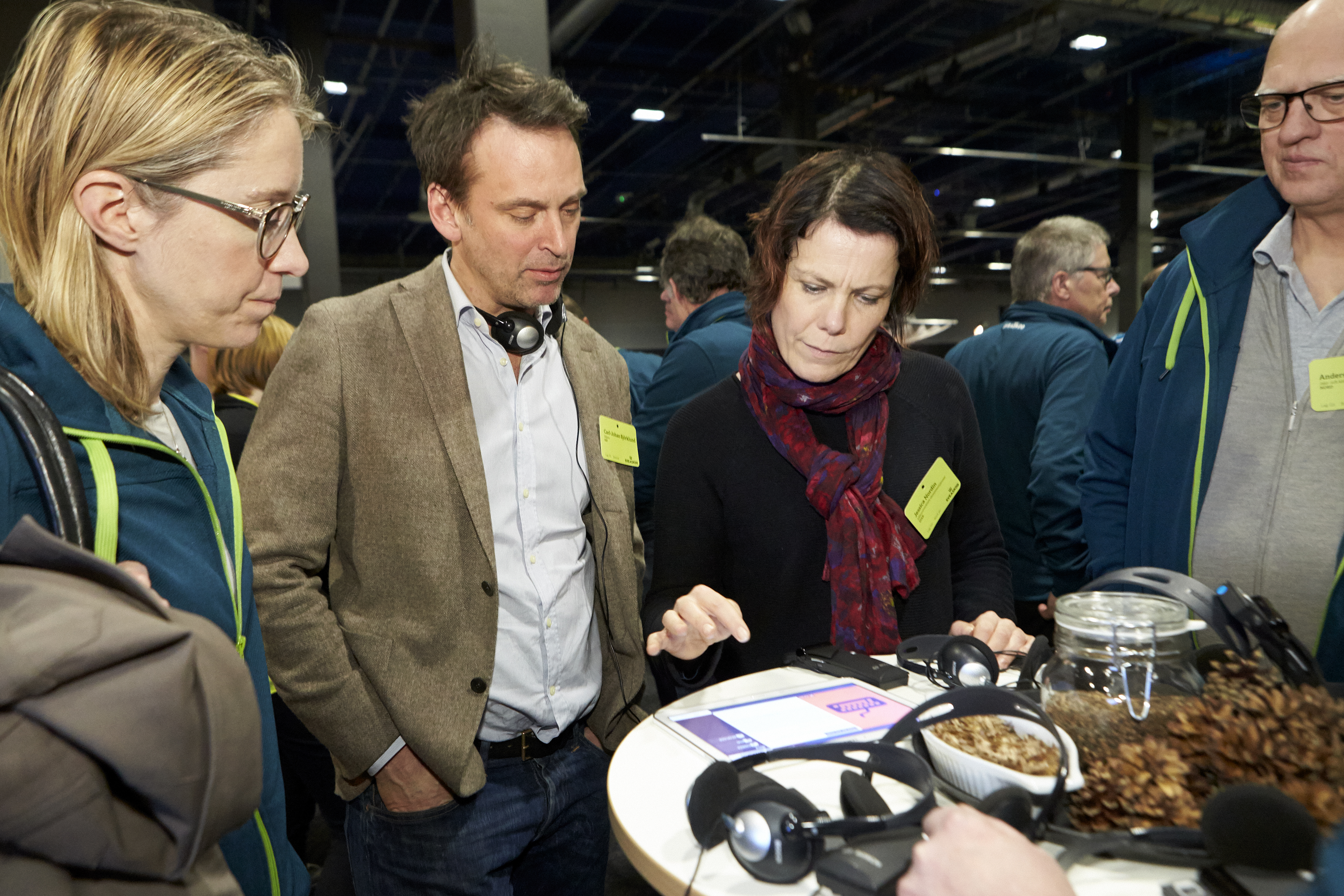• Beskrivning: Carl-Johan Björklund, Jessica Nordin, Anders med flera, gruppövning, grupparbete, team building, samlade runt platta, surfplatta, tablet, Sveaskogsdagarna 2017, dialog, möte, hela företaget samlat, expo