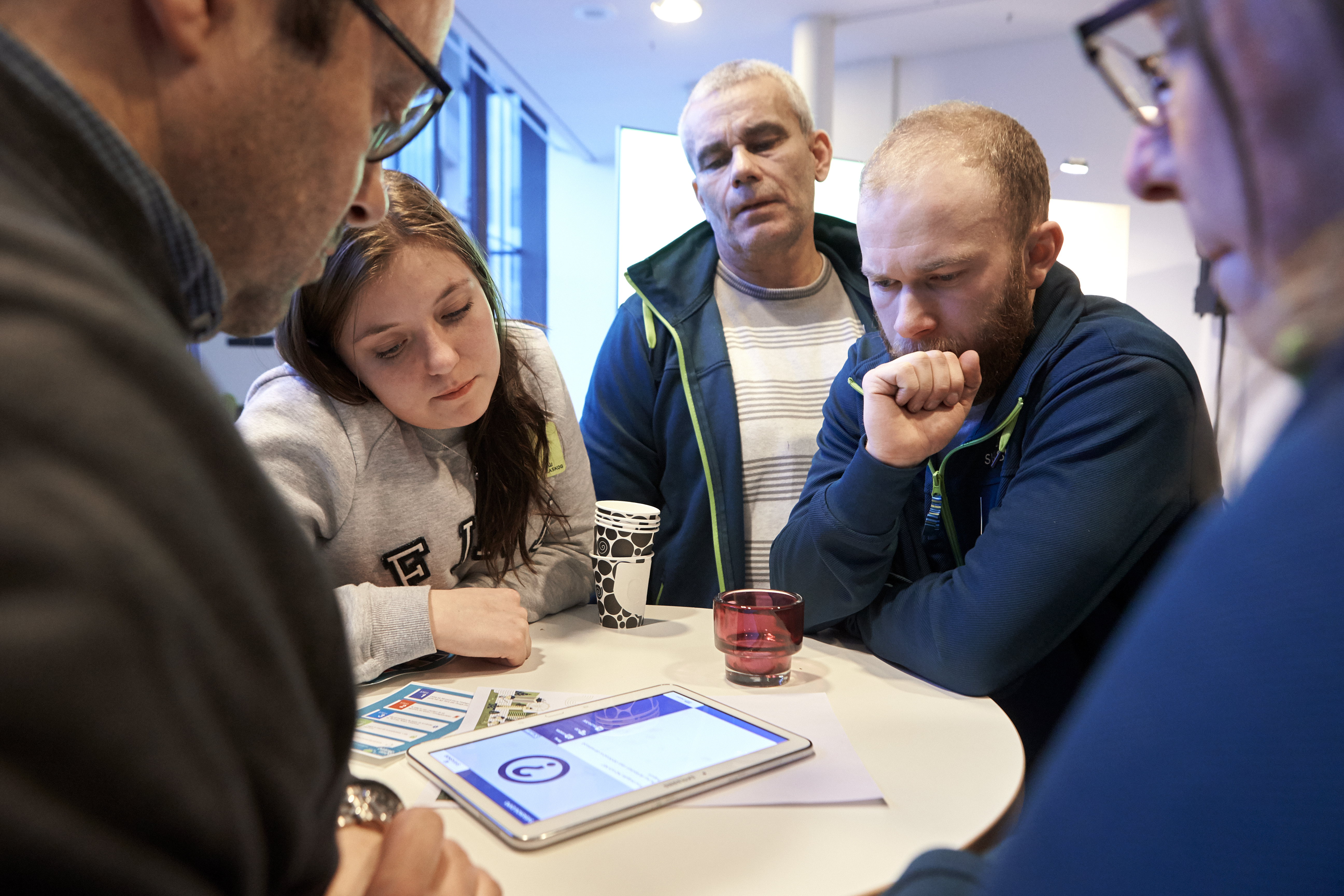 • Beskrivning: gruppövning, grupparbete, team building, samlade runt platta, surfplatta, tablet, Sveaskogsdagarna 2017, dialog, möte, hela företaget samlat, expo