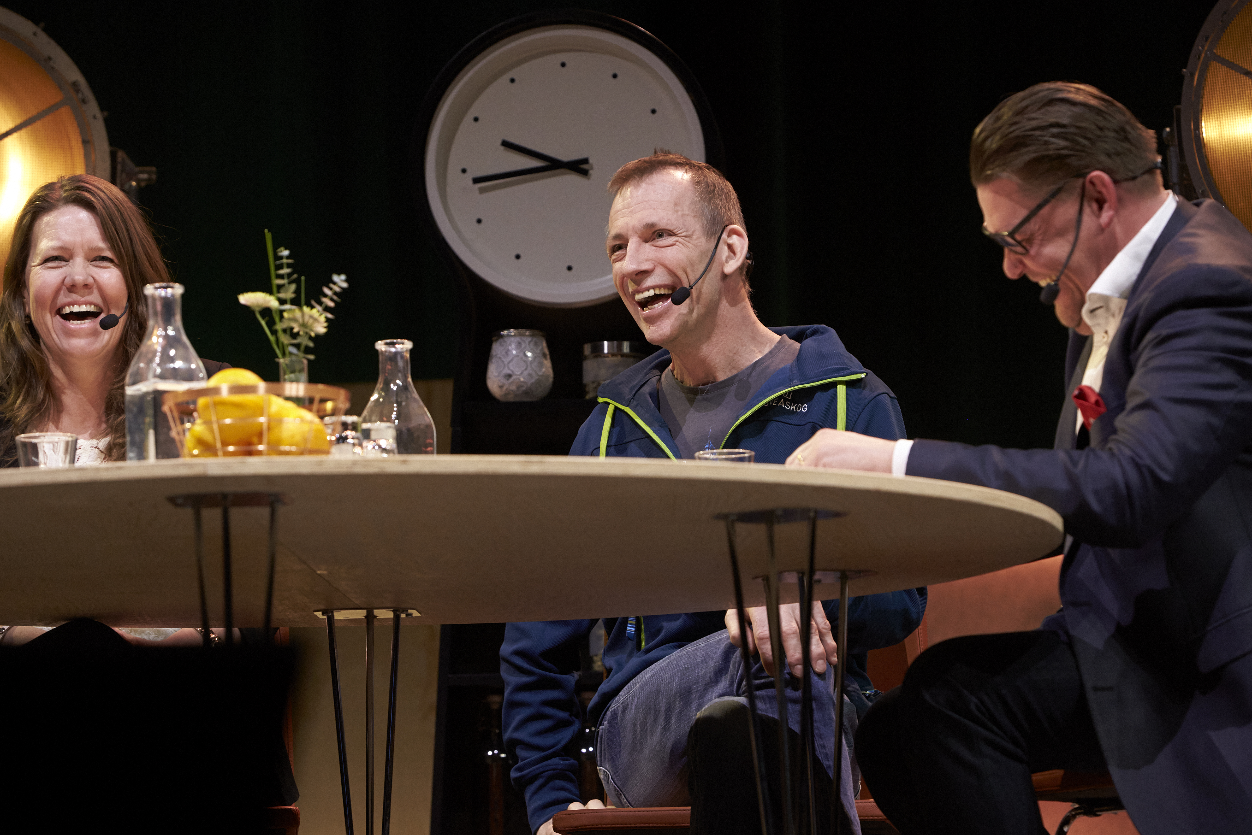 - Beskrivning: panel, scen, klocka, Anette Waara, x och Ola Söderdahl, skämt, skratt, glädje, samtal, Sveaskogsdagarna 2017, dialog, möte, hela företaget samlat, expo