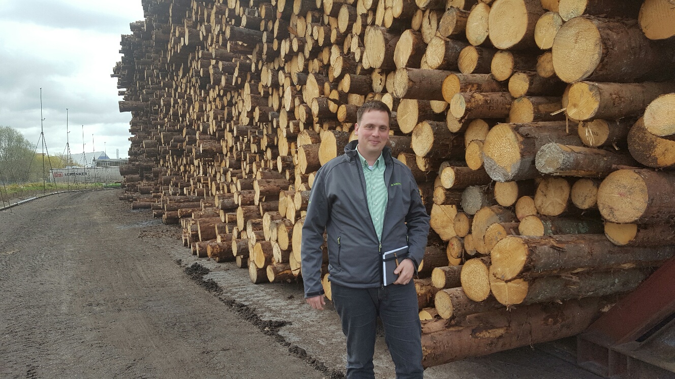 - Beskrivning: Matthias Markwort med det norrbottniska grantimret, Timmerleverans till Tyskland, grantimmer, leverans, I mitten av mars gick för första gången någonsin en båt från Haraholmen i Piteå lastad med grantimmer för leverans till Wismar i Norra Tyskland