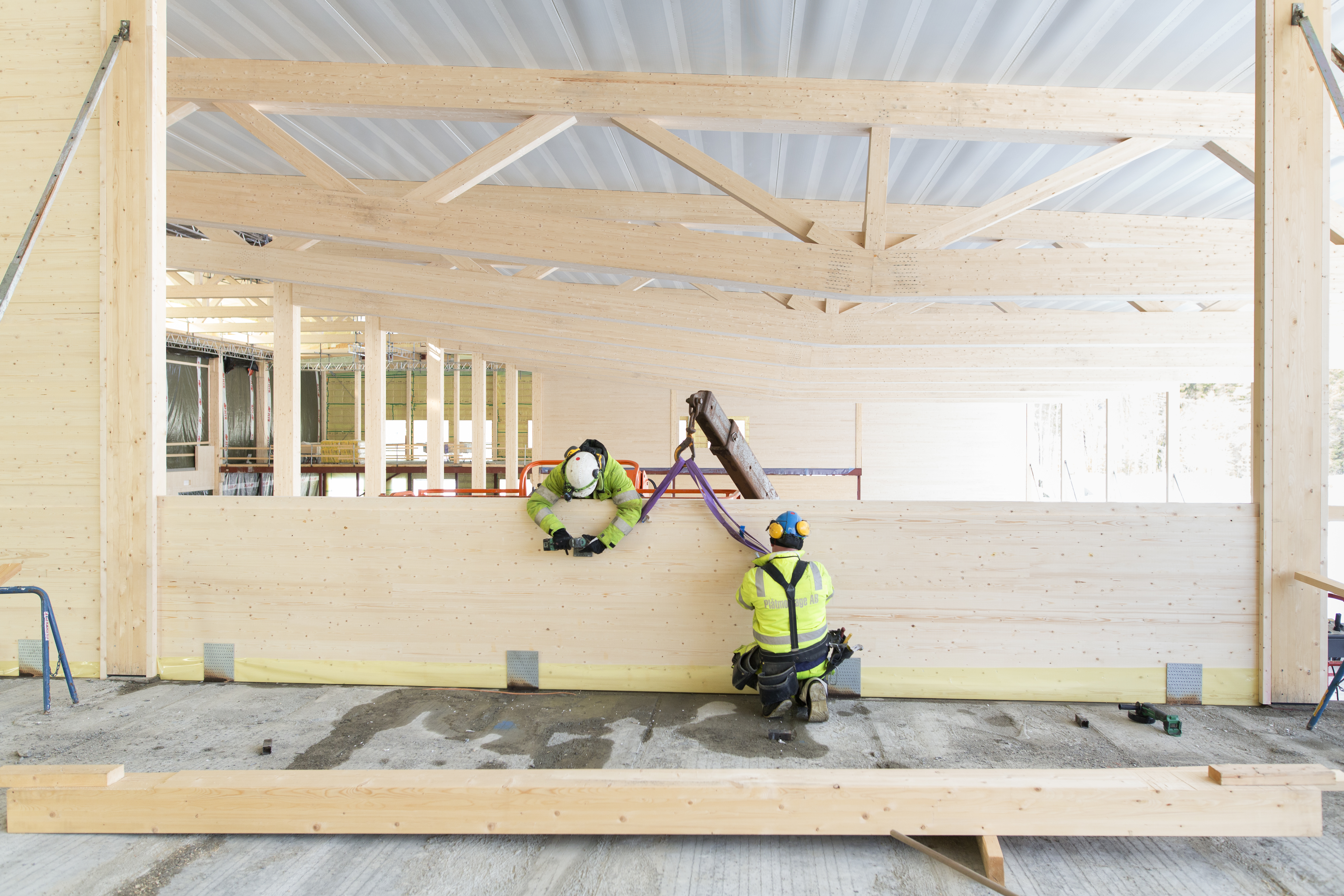 • Beskrivning: Andrey Pichugin bor i Hova. Han jobbar för Plåtmontage I Ljusdal AB som idag finns i Göteborg. Och de i sin tur har uppdraget på bygget av ny högstadieskola på Morö Backe i Skellefteå på uppdrag av Martinsons, träbyggnation, Martinsons, montage, KL-trä, klimatsmart, hållbart material, hållbarhet, trähus,
