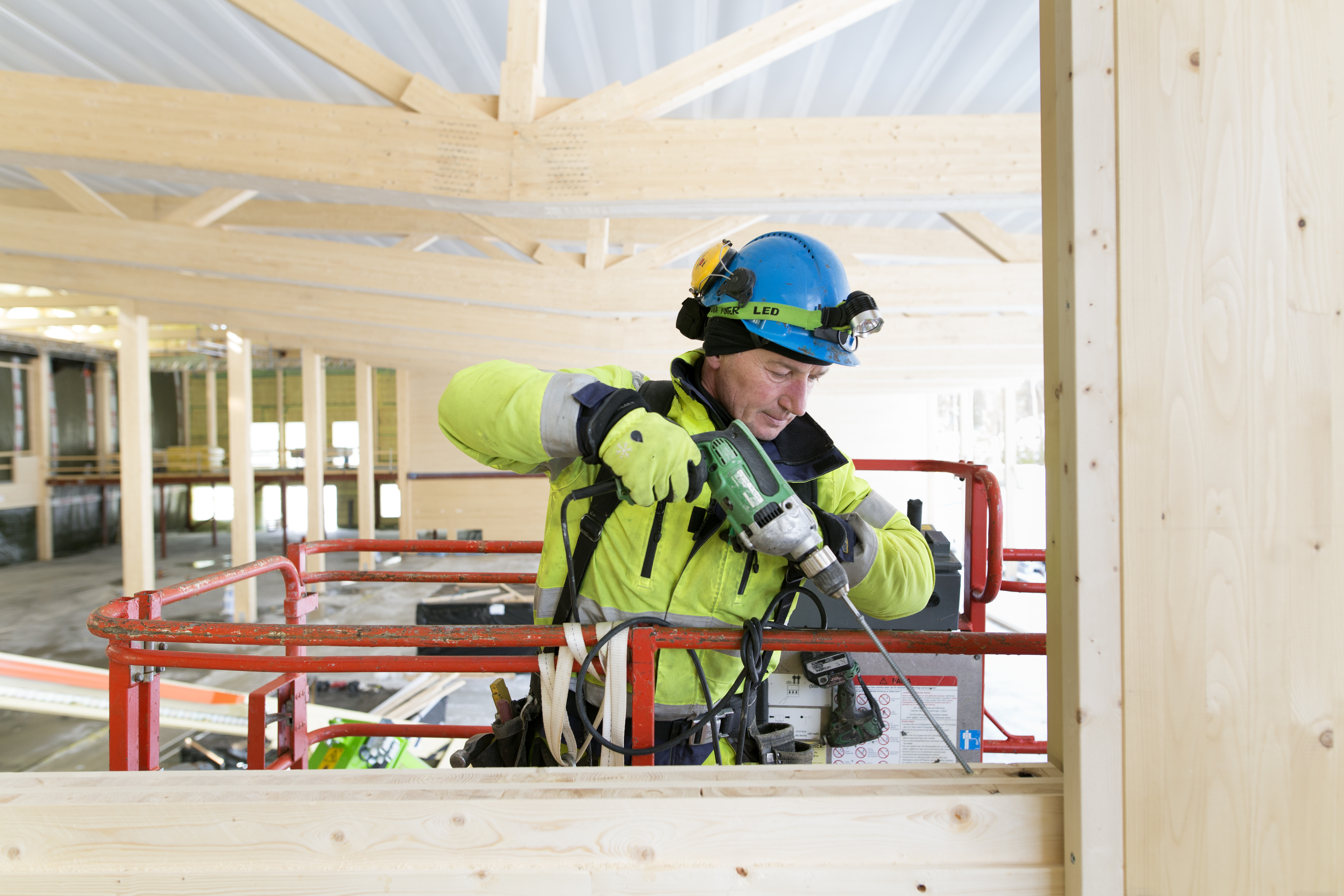 • Beskrivning: Andrey Pichugin bor i Hova. Han jobbar för Plåtmontage I Ljusdal AB som idag finns i Göteborg. Och de i sin tur har uppdraget på bygget av ny högstadieskola på Morö Backe i Skellefteå på uppdrag av Martinsons, träbyggnation, Martinsons, montage, KL-trä, klimatsmart, hållbart material, hållbarhet, trähus,