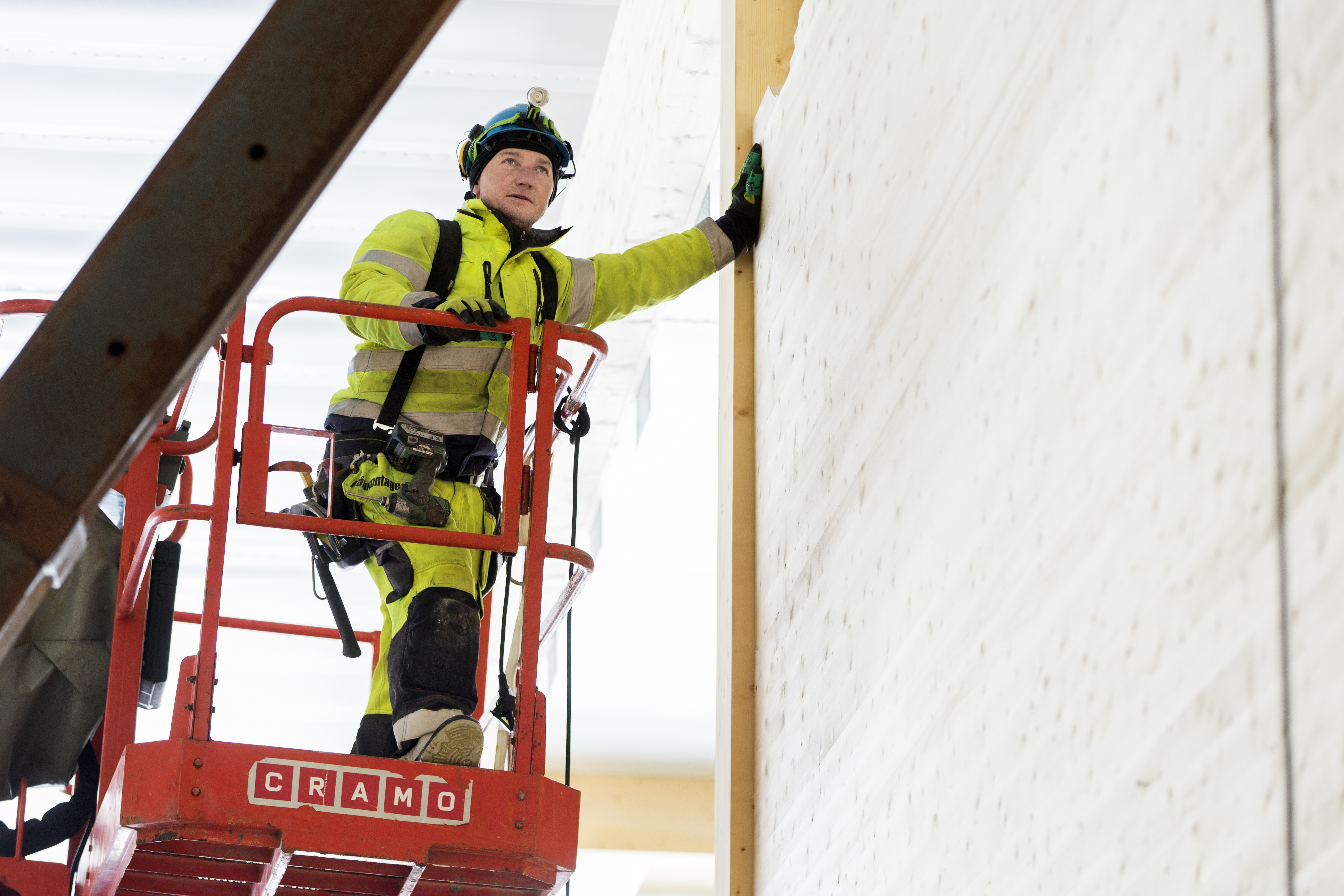 • Beskrivning: Andrey Pichugin bor i Hova. Han jobbar för Plåtmontage I Ljusdal AB som idag finns i Göteborg. Och de i sin tur har uppdraget på bygget av ny högstadieskola på Morö Backe i Skellefteå på uppdrag av Martinsons, träbyggnation, Martinsons, montage, KL-trä, klimatsmart, hållbart material, hållbarhet, trähus,