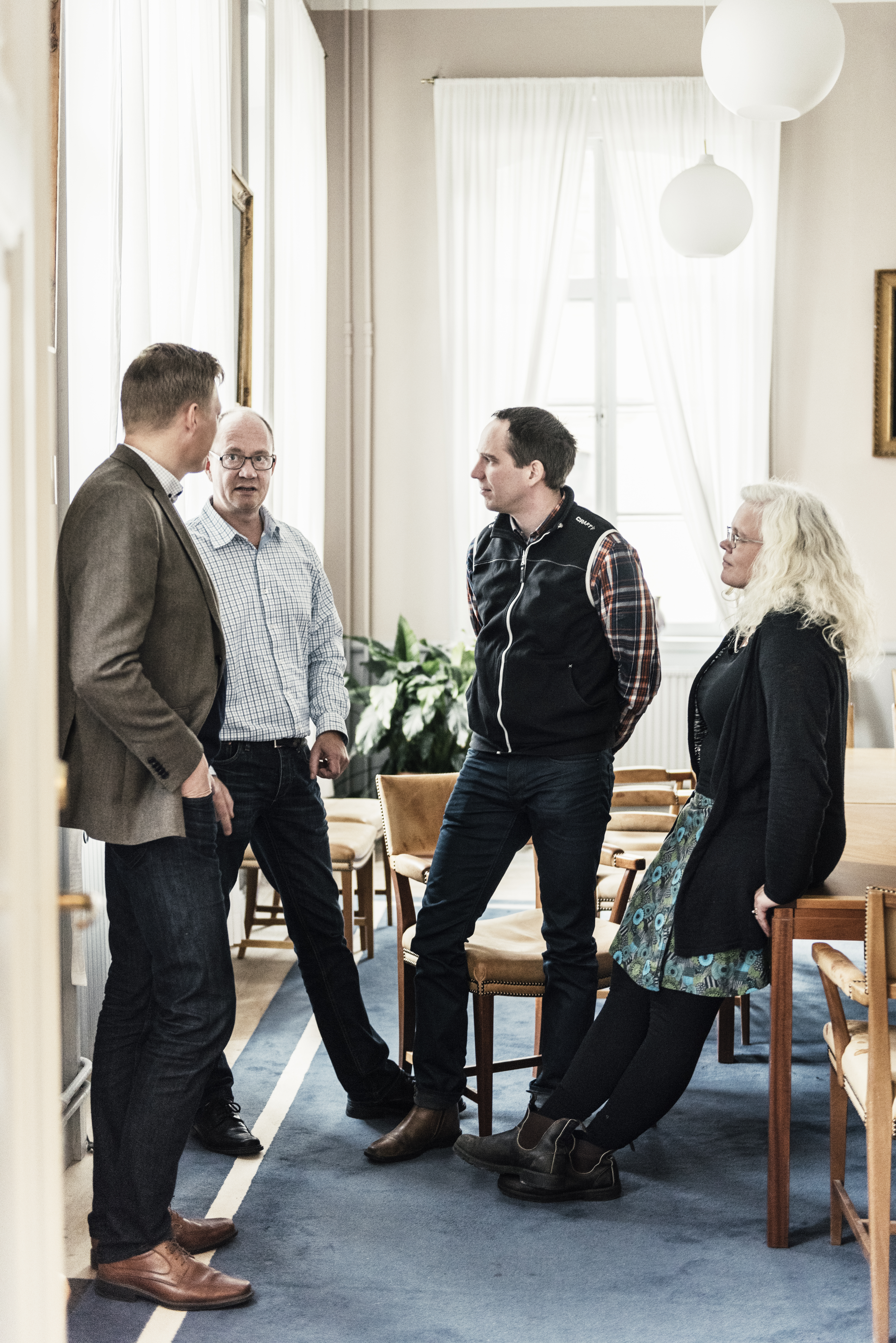 - Beskrivning: Roger B Johansson, Urban Nordmark, Jesper Östensson och Gisela Björse, Möte om avverkningsberäkningar, samtal, dialog, Lantbruksakademins bibliotek, diskussion om hur arbetet gått, fotöljer