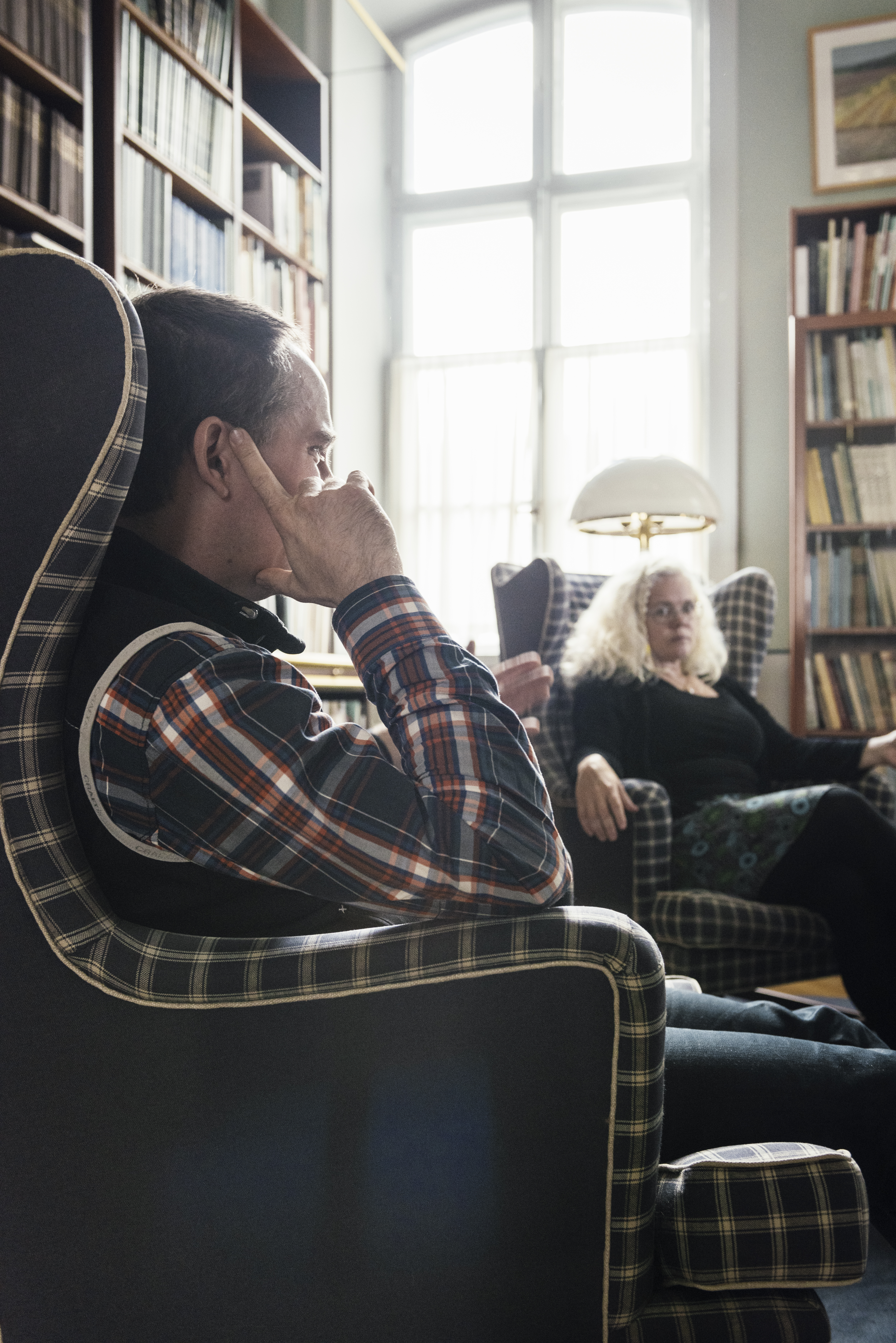 - Beskrivning: Funderar, fundering, Möte om avverkningsberäkningar, samtal, dialog, Lantbruksakademins bibliotek, diskussion om hur arbetet gått, fotöljer