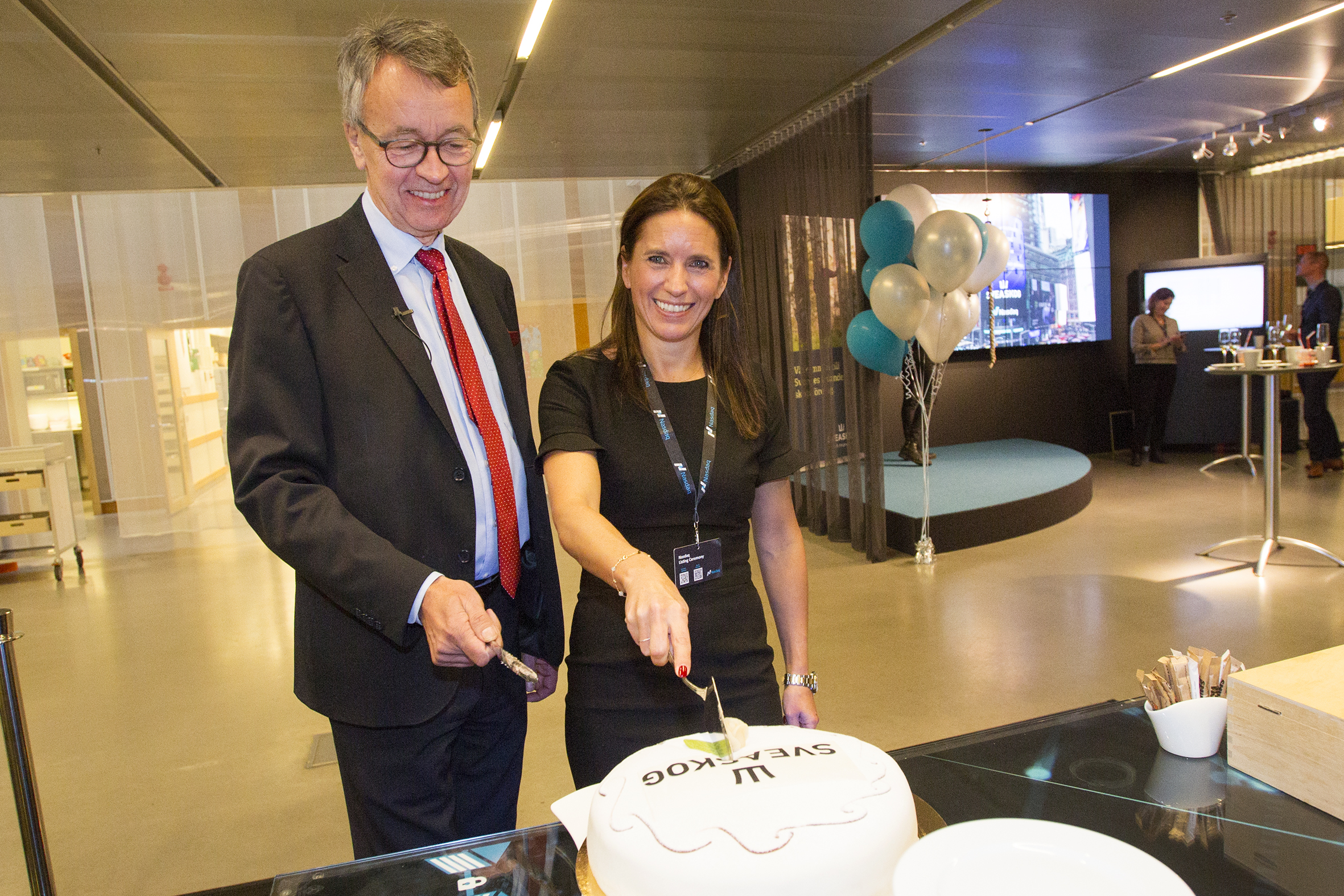 - Beskrivning: Per-Olof Wedin, PO, skär tårta, inringningen av Sveaskogs andra gröna obligation på Nasdaq den 27 oktober 2017, grön obligation