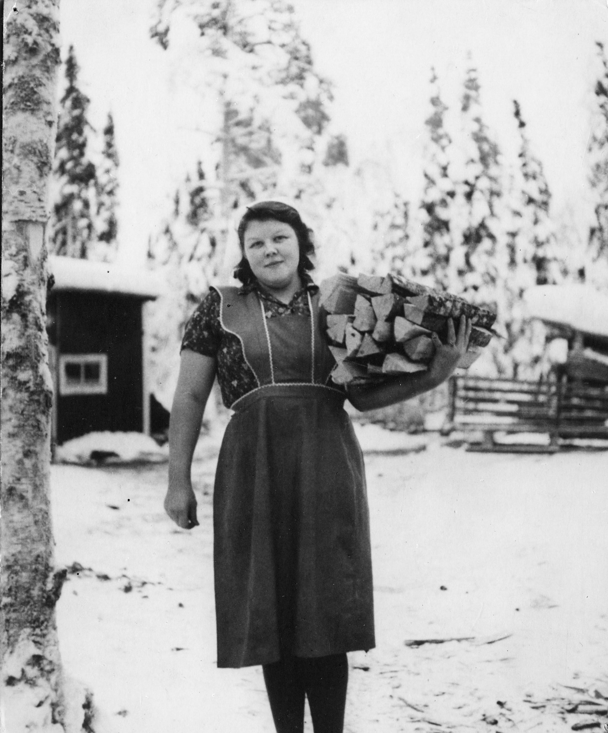 - Beskrivning: Kvinnor i skogsbruket genom historien, bild från skogsmuseets arkiv, bild från förr, svartvitt foto, inskannat foto,