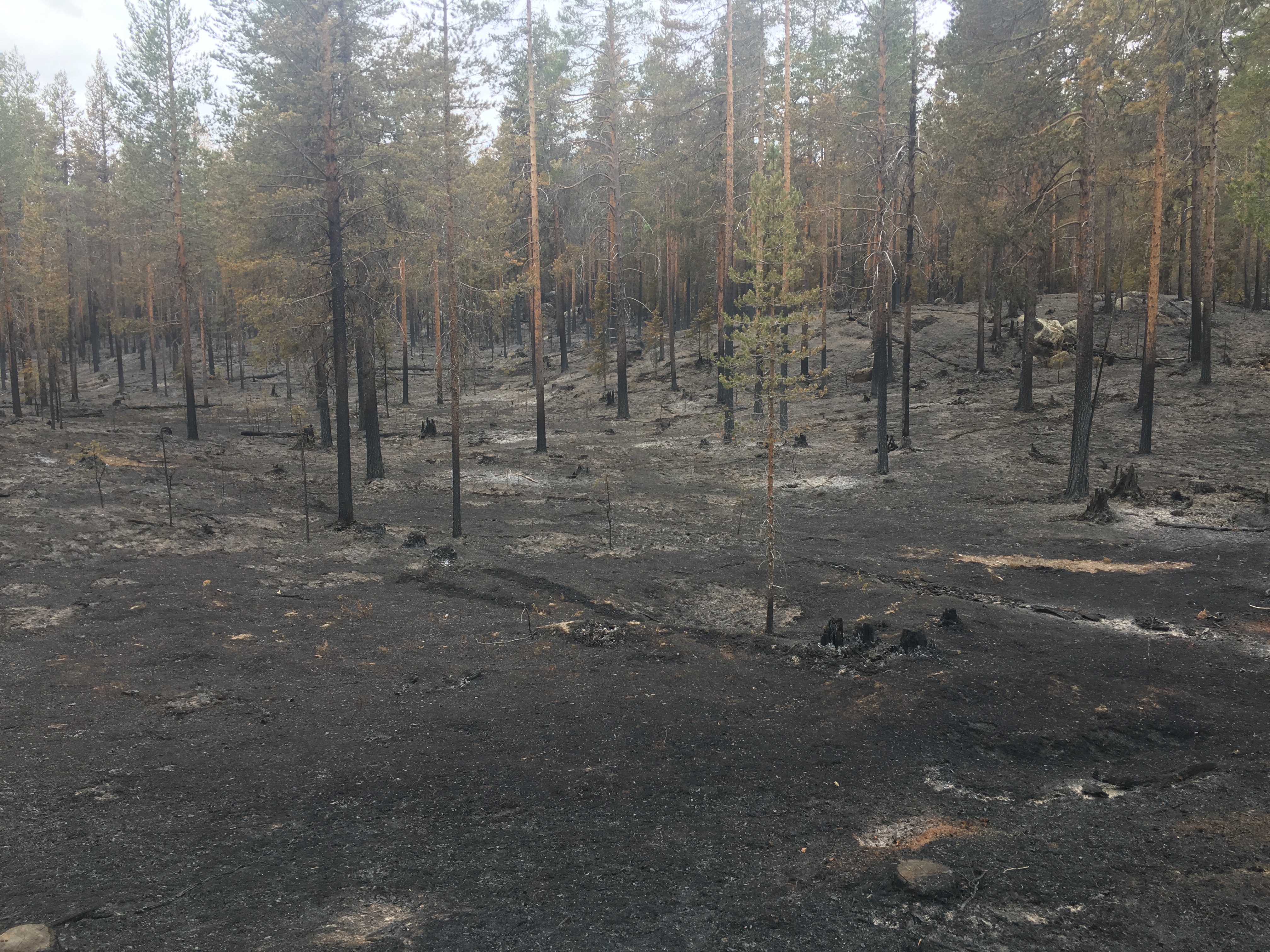 - Beskrivning: Efter skogsbränderna 2018, skogsbrand, efter brand, eftersläckning, aska, nedbränd skog