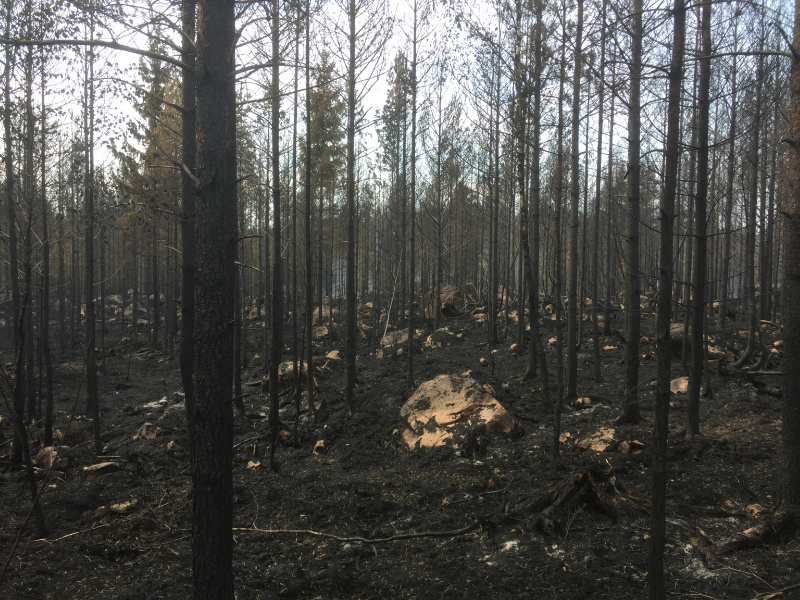 - Beskrivning: Efter skogsbränderna 2018, skogsbrand, efter brand, eftersläckning, Efter Kostabranden, aska, nedbränd skog, 35-årig bränd tallskog