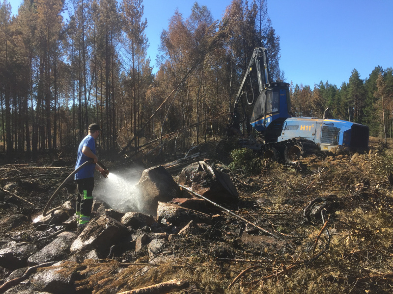 Eftersläckning av glödhärd i dikeskant medan skördaren pausar