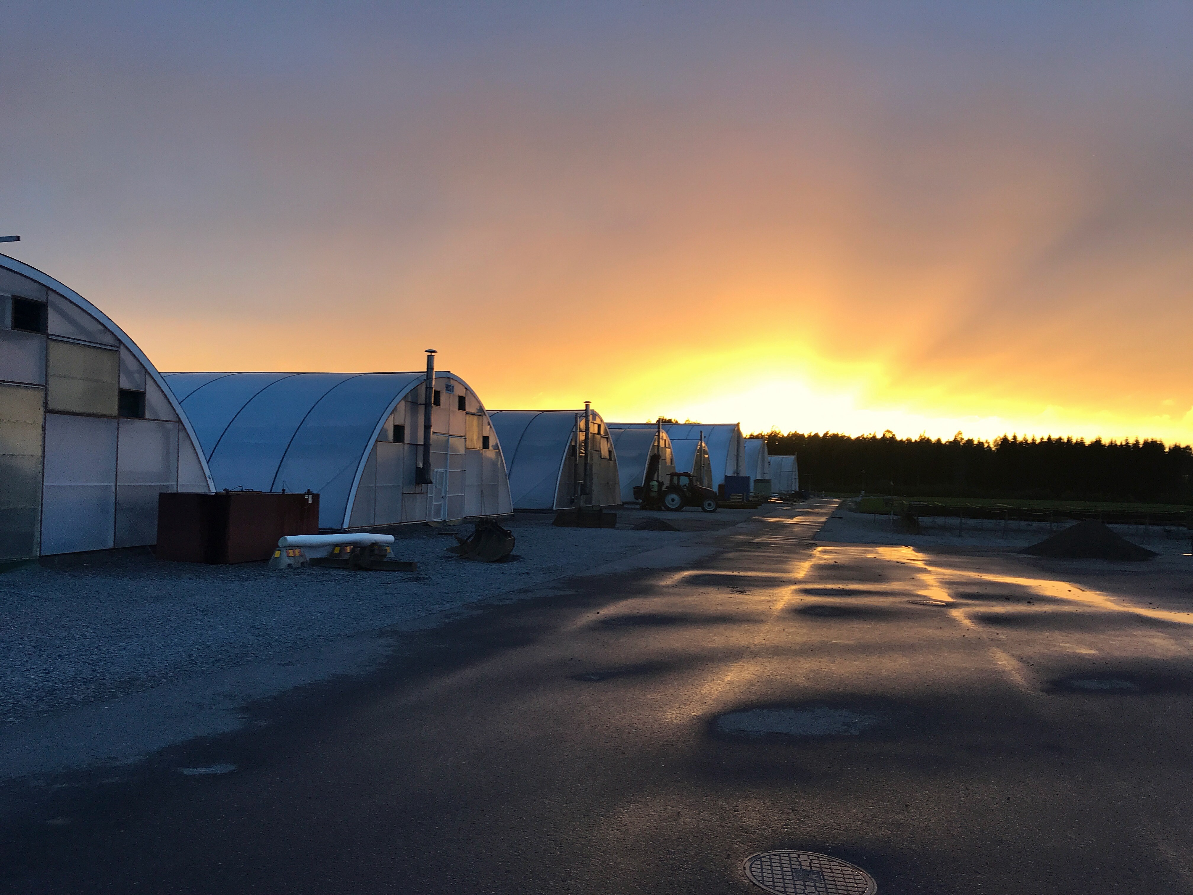• Beskrivning: Vibytorps plantskola, plantskola, plantor, solnedgång, vackert, glödande himmel, växthus, plantage, bevattning