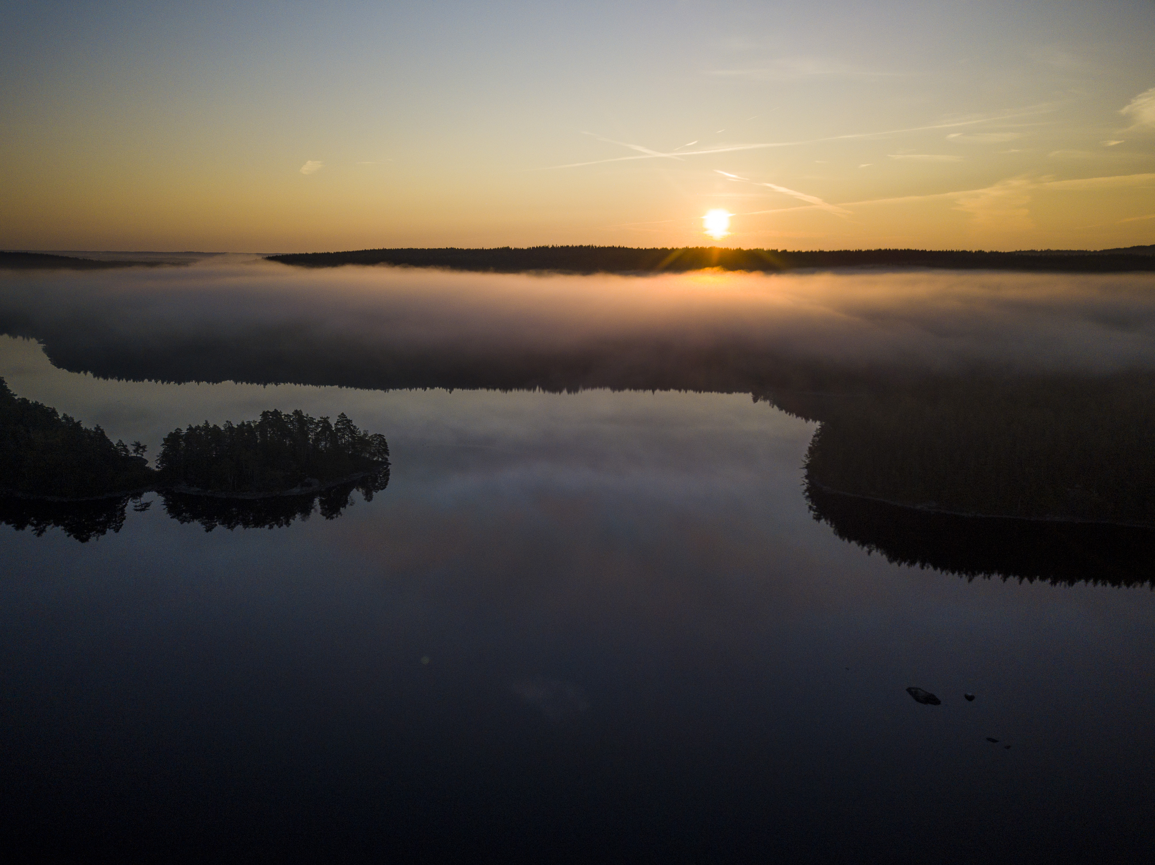 • Beskrivning: Ekopark Raslången, solnedgång/soluppgång över sjö