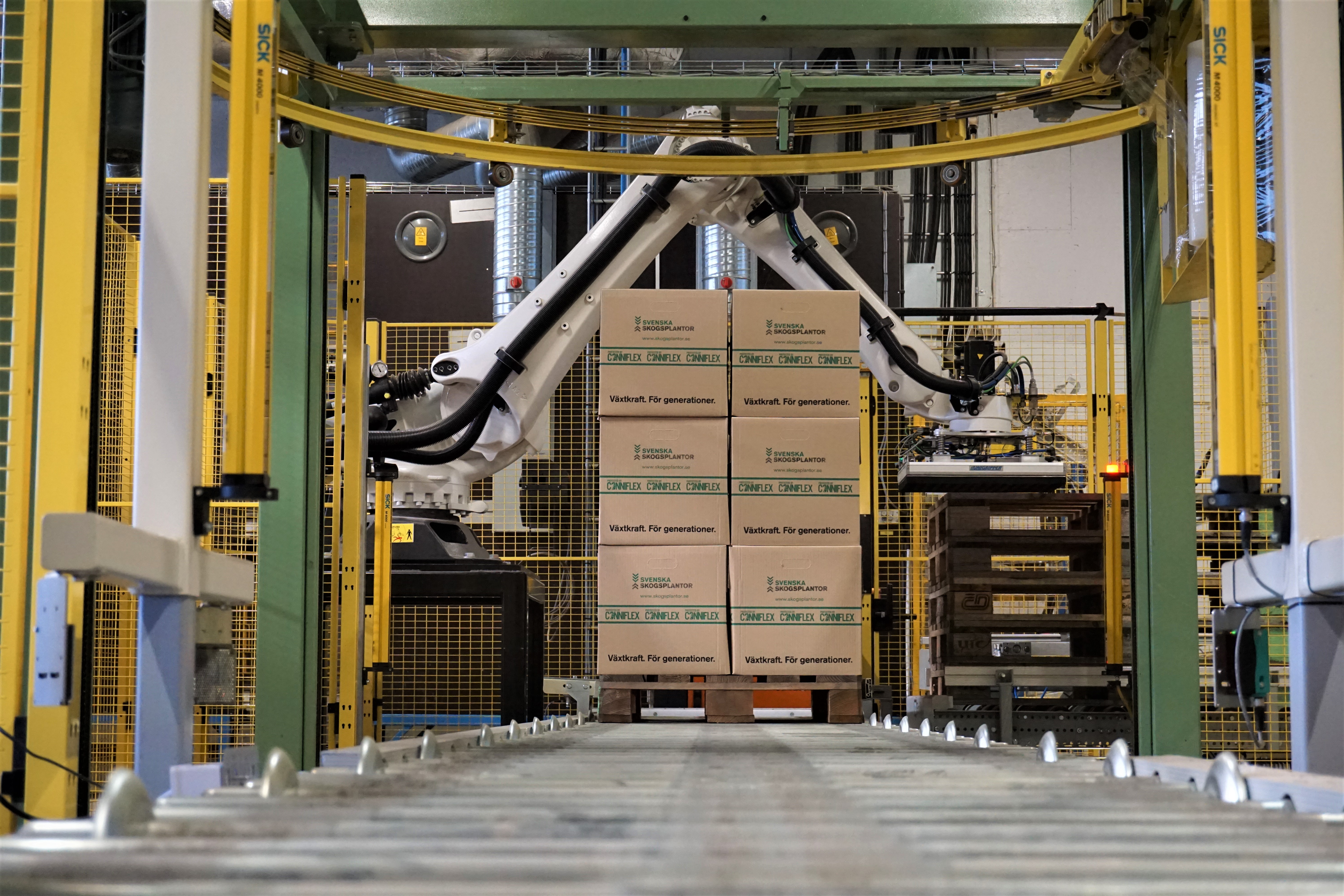 • Beskrivning: Packing av plantor i packlinjen på Vibytorps plantskola, låda, kartong, produktion, produktionslinje, förpackningar